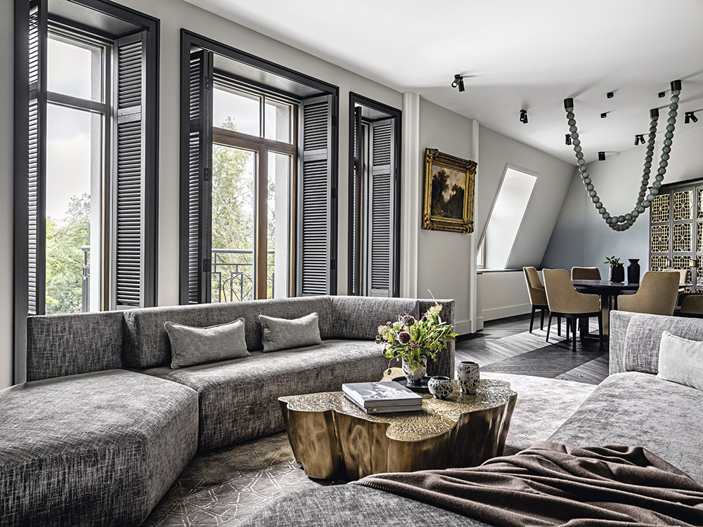 Благодаря тому, что заказчики уже не в первый раз сотрудничали с бюро, работа и над этим проектом прошла с легкостью и пониманием. Нестандартная форма квартиры дала возможность сделать планировочное решение нетривиальным, а ее большая площадь позволила с удобством разместить все необходимые комнаты и подсобные помещения. Самую сложную геометрию имеет гостиная, объединенная с прихожей широким порталом, — ее открытое студийное пространство включает в себя диванную, обеденную и кухонную зону. Центр гостиной — два элегантных дивана из коллекции французского дизайнера CHRISTOPHE DELCOURT, между ними разместилась впечатляющая модель журнального столика от португальского производителя BOCA DO LOBO — каркас столика изготовлен из полированной латуни с патиной, а его столешница украшена гравировкой. Над большим обеденным столом на шесть персон подвешен дизайнерский светильник в виде нанизанных на ниточку стеклянных шаров — необычная модель Halti английской фабрики CAMERON DESIGN HOUSE. Украшением обеденной зоны служит черный буфет с золотистыми узорчатыми