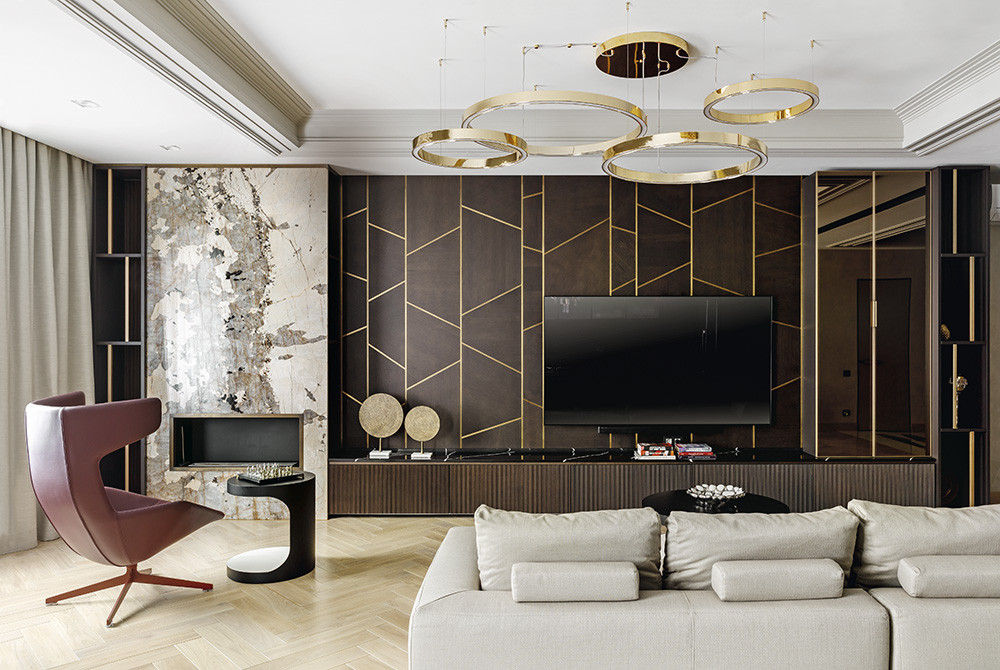 Непросто бывает соблюсти баланс между роскошью и уютной атмосферой, особенно если заказчики выбирают современный стиль — всё-таки лаконизм эмоционально «прохладен», его надо дополнительно «согревать». Эта квартира — идеальный пример такого баланса: все цвета, формы, материалы, фактуры и текстуры — из арсенала современного стиля, но при этом всё вместе складывается в художественно богатый, нескучный, элегантный интерьер.