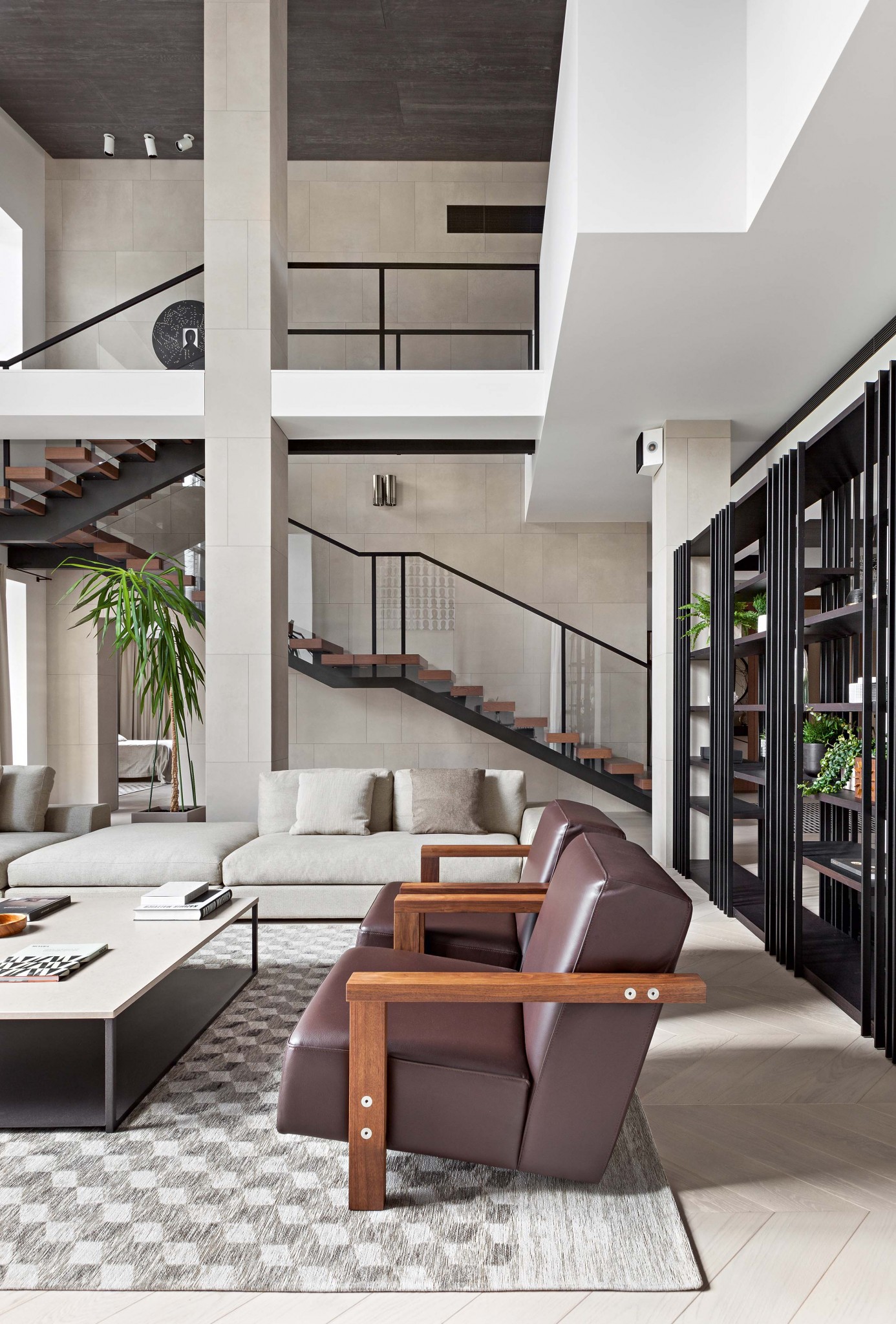 Владельцы дома — семейная пара. Супруг — состоявшийся бизнесмен, жена занимается наукой. Дети уже взрослые: дочь студентка университета, а сын живёт и работает в Лондоне. Заказчик нашёл Александра Кратовича по публикации в одном из интерьерных журналов, обратив внимание на то, как архитектор работает с пространством. «Заказчик прекрасно разбирается в дизайне, и он поставил передо мной высокую планку,— рассказывает автор проекта.— В своё время он с семьёй уже жил в дизайнерской квартире, сейчас супруги много путешествуют, постоянно посещают международные художественные выставки. Для них был одинаково важен как функциональный, так и визуальный комфорт. Мне пришлось потратить много часов на поиск и презентацию заказчику оптимальных решений. Результат превзошёл его ожидания ». Привлечённый изначально к разработке интерьера, Александр, как архитектор, не мог оставить без внимания сам дом (его строительство тогда только начиналось). Планировочные решения и внешний облик дома вызывали много вопросов и требовали существенной доработки. В итоге он не только реализовал интерьер, но и выполнил тюнинг всего здания: увеличил полезную площадь дома, доработал фасады, изменил внутреннюю организацию пространства и в конце концов полностью сформировал концепцию дома. Снаружи здание отделано материалами в тёмных тонах, а внутри, наоборот, доминируют светлые оттенки —получился эффектный контраст между экстерьерным и интерьерным решениями. Ощущение лёгкого, пронизанного светом пространства достигнуто путём построения главных видовых точек с перспективой на открытые пространства и панорамные окна. «Гостиная — главное помещение в доме. Она, как мне кажется, должна превосходить все остальные комнаты как по размеру, так и по визуальному впечатлению. Я так и сделал. Именно на неё приходится основной акцент. А вот спальня,