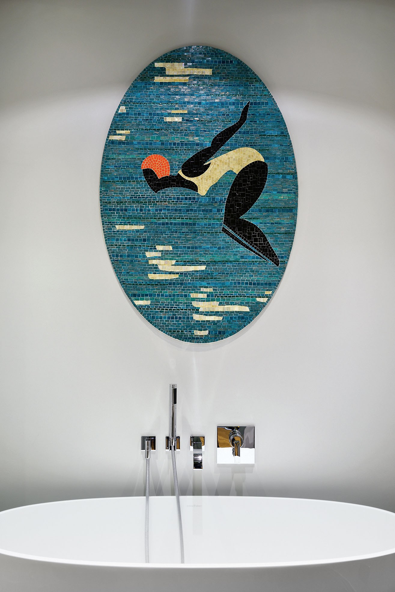 Когда шла работа над этим интерьером, дизайнер Ольга Амлинская была увлечена эстетикой 1960-х годов и стилистикой ар–деко. Для оформления ванной комнаты декор подбирался особенно тщательно: украшение стены над отдельно стоящей овальной ванной должно было стать центром симметричной композиции. Чтобы передать точные ощущения той эпохи и совпасть с образом хозяйки дома, было решено сделать мозаичное панно на заказ. Был выбран сюжет с ныряльщицей, объединивший в себе образ аналогичной скульптуры из Нескучного сада и эмблемы советского журнала «Юность». Художник Ольга Солдатова выполнила это панно в колористике всего интерьера.