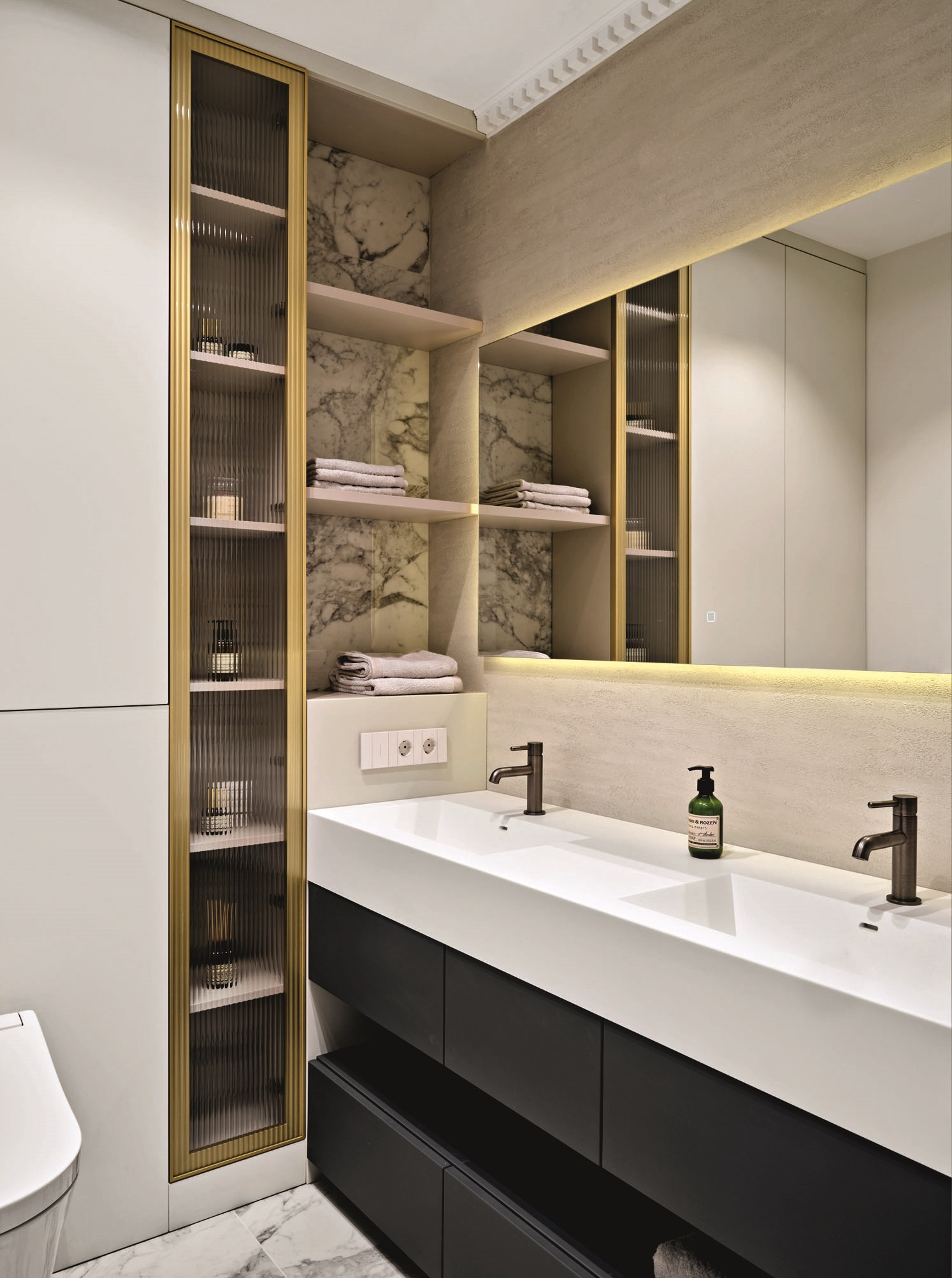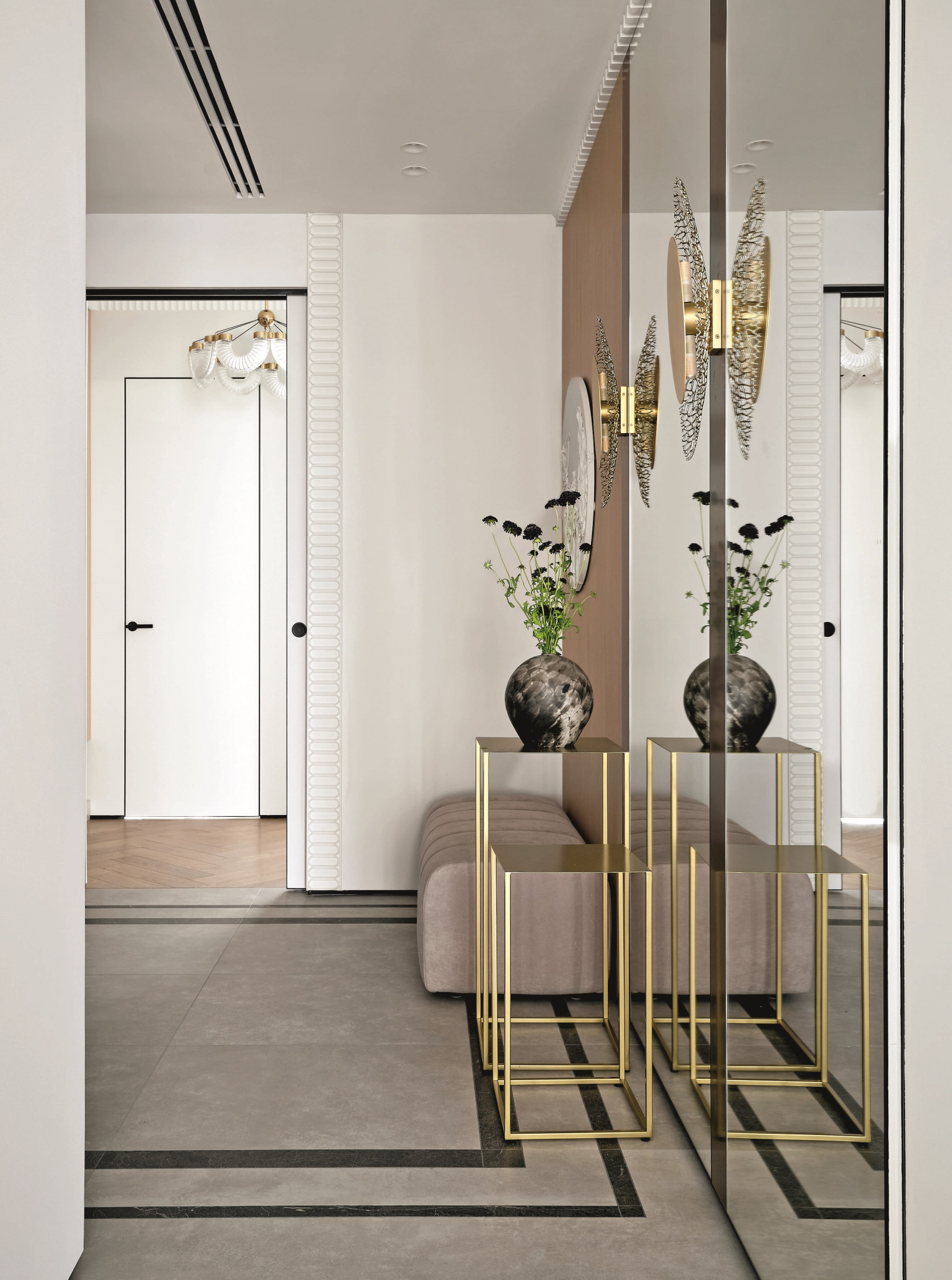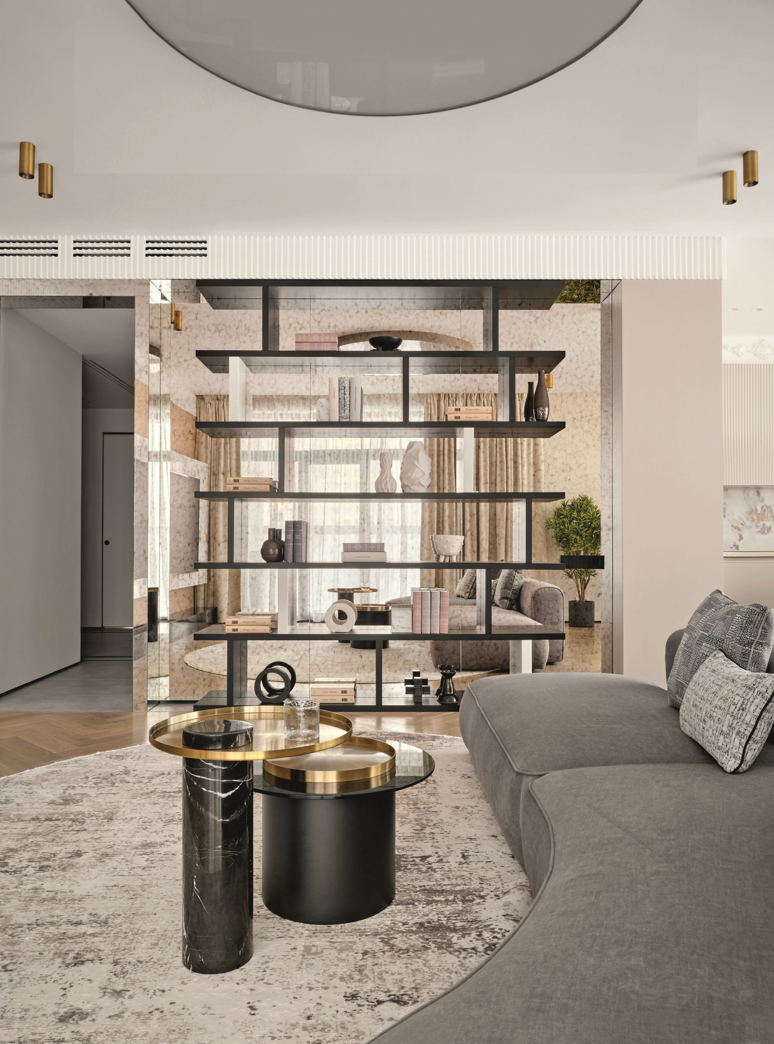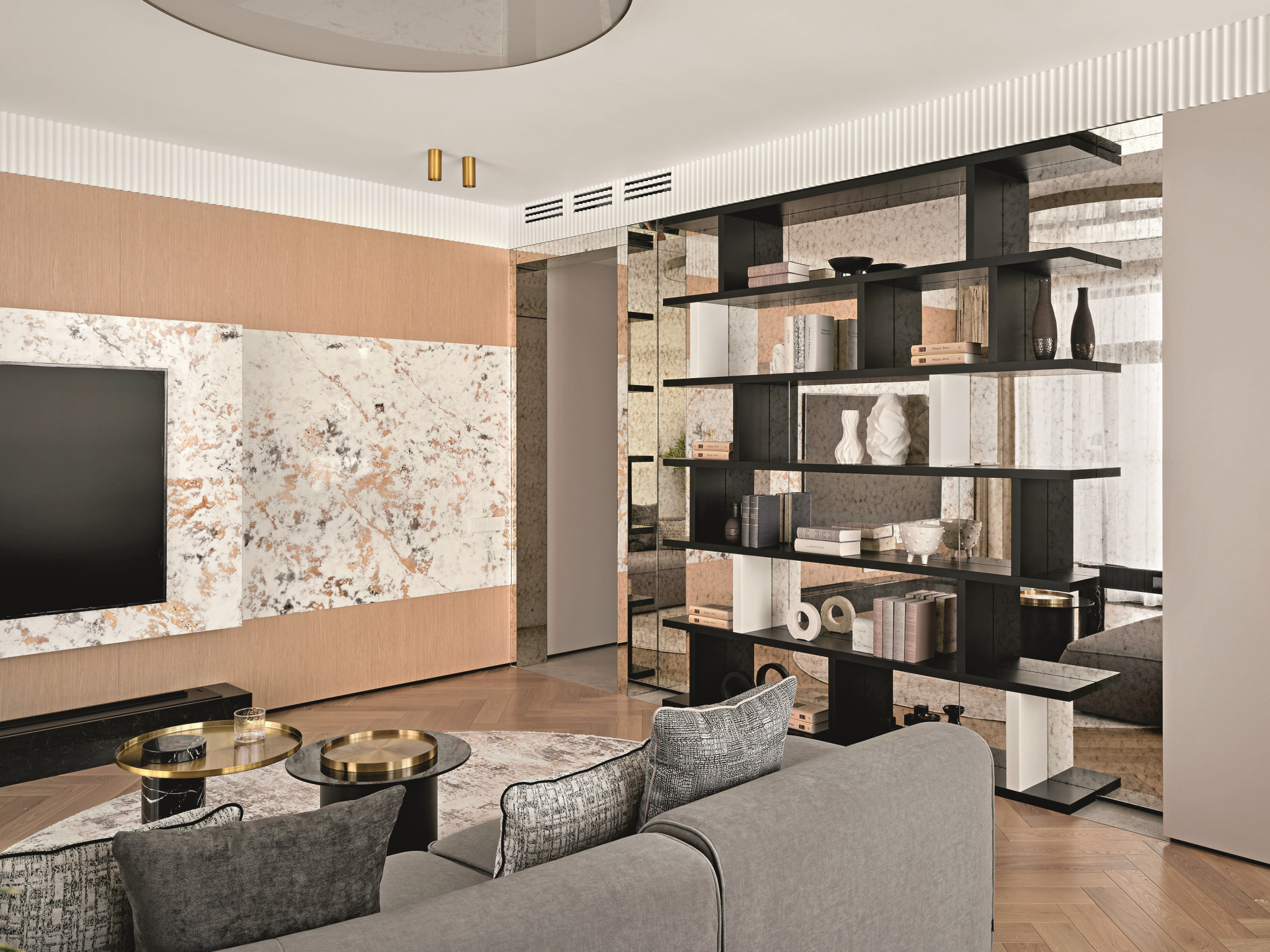 На объекте много окон, панорамного остекления, что ограничивало возможности по расстановке мебели. «Нам хотелось сделать пространство легким, сохранить воздушность, избежать массивных линий в интерьере. Поэтому мы использовали большое количество зеркал для отражения света и различные сценарии освещения, — дополняет Анастасия Кацева. — Так, центральным элементом интерьера гостиной стало эффектное панно в стиле шебби-шик из состаренного зеркала, созданное компанией «Иванов Благих». Полки, расположенные поверх зеркала, играют роль стеллажа. Панно плавно и органично перетекает в ТВ-зону, декорированную натуральным кварцем и стеновыми панелями из шпона светлого дерева».