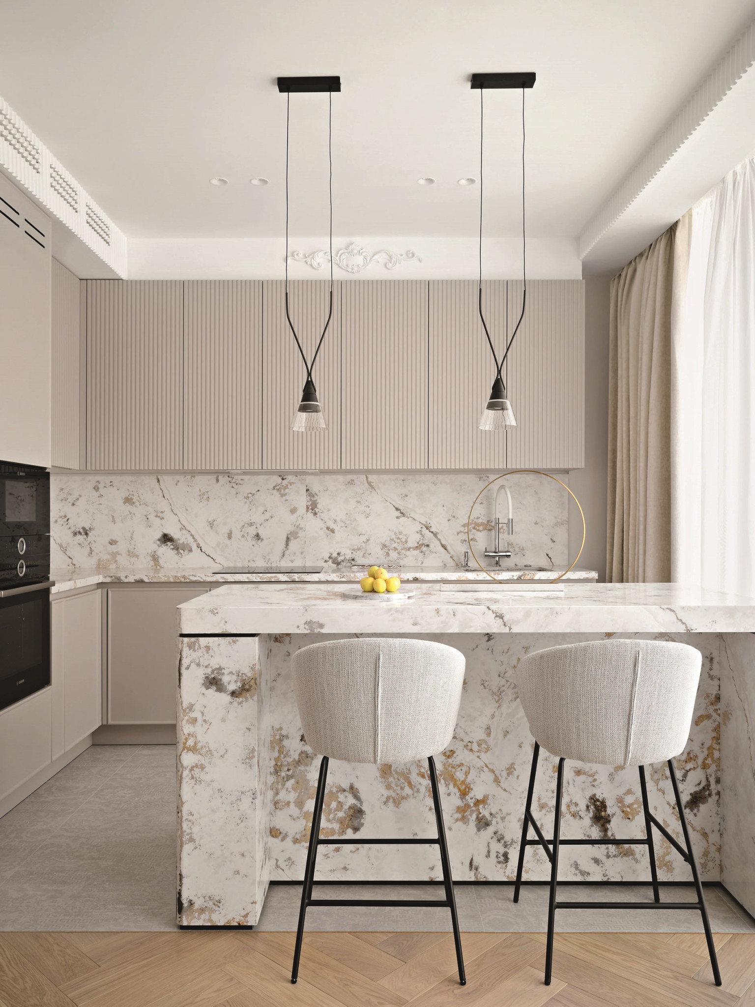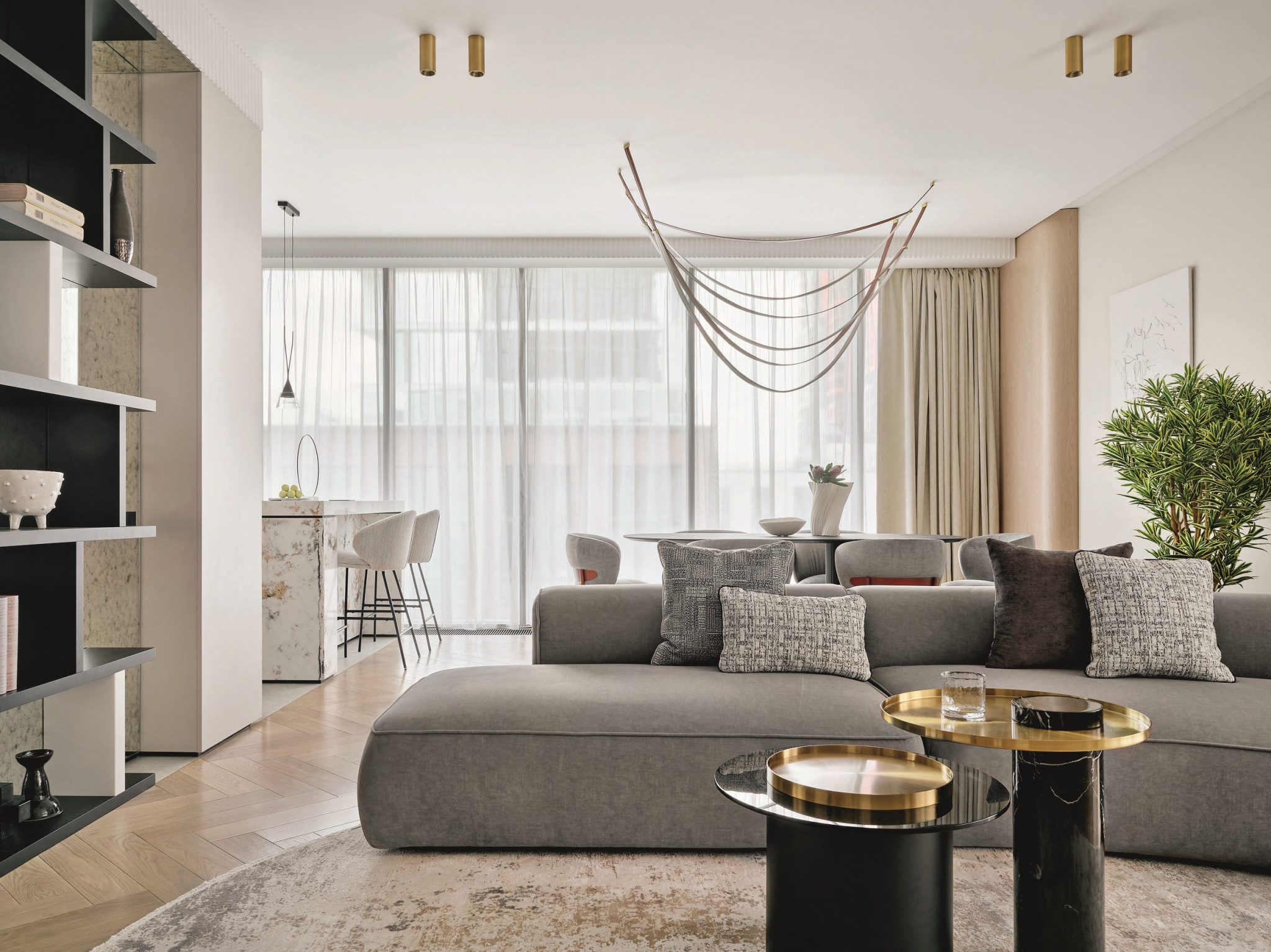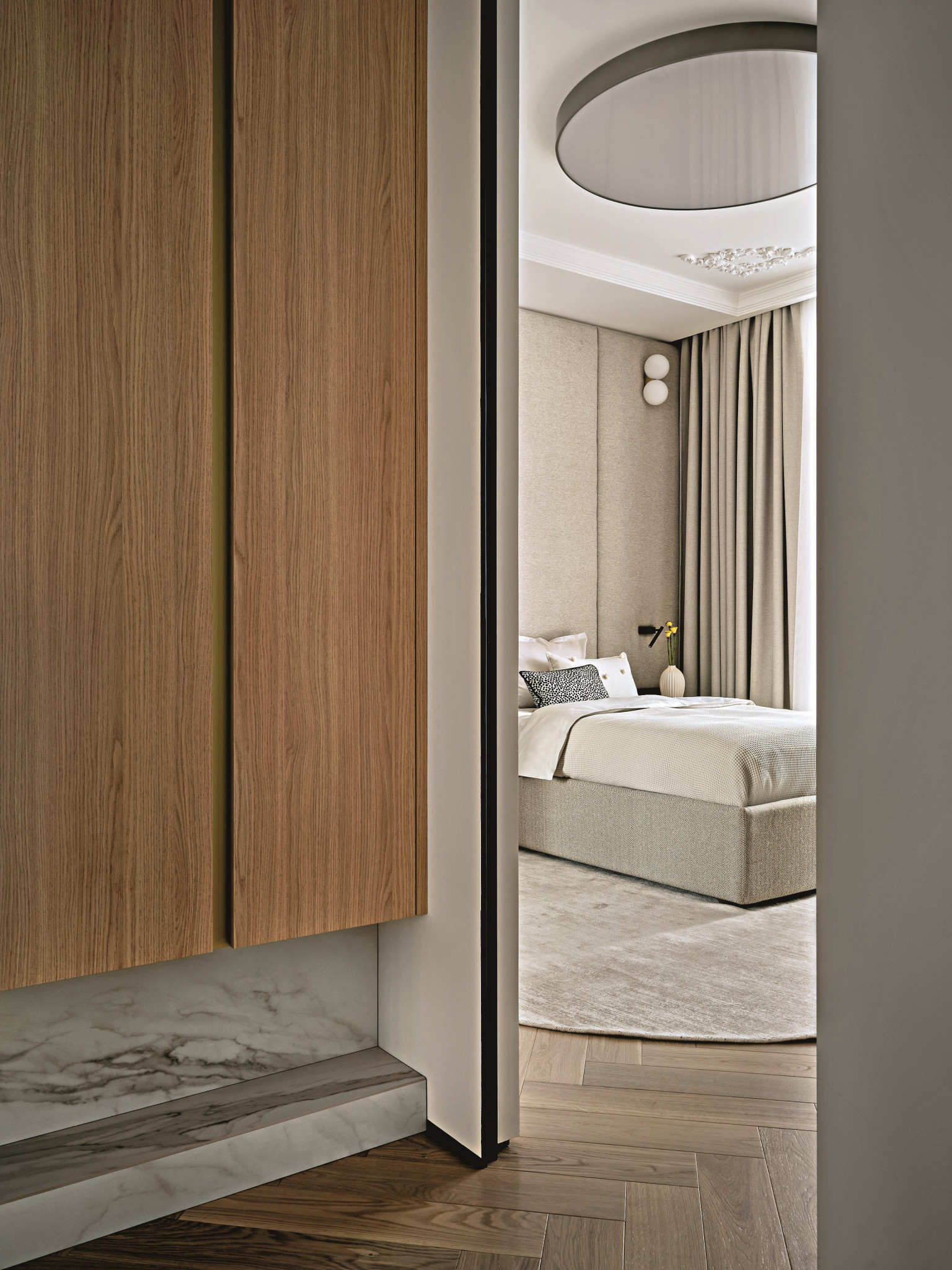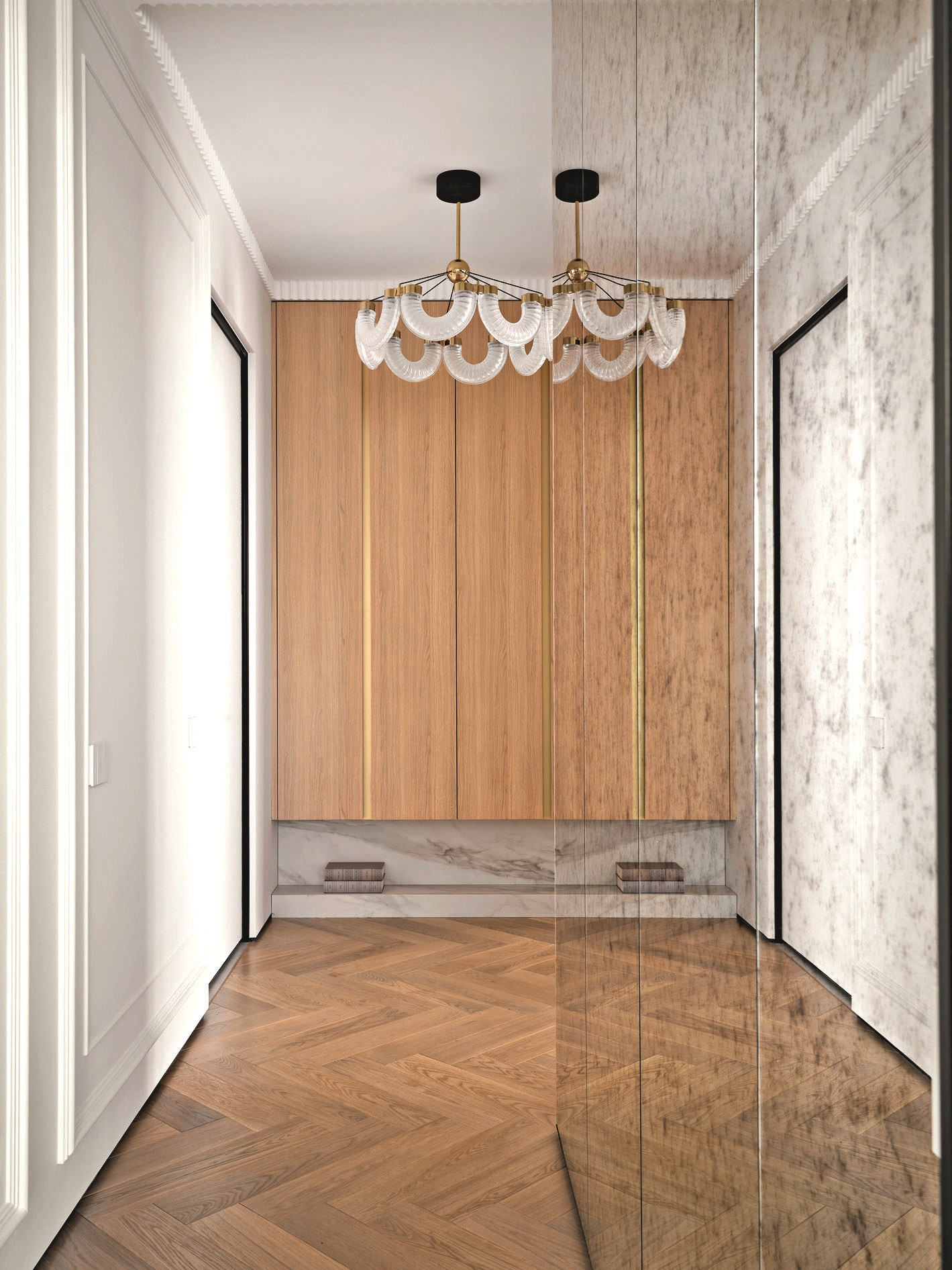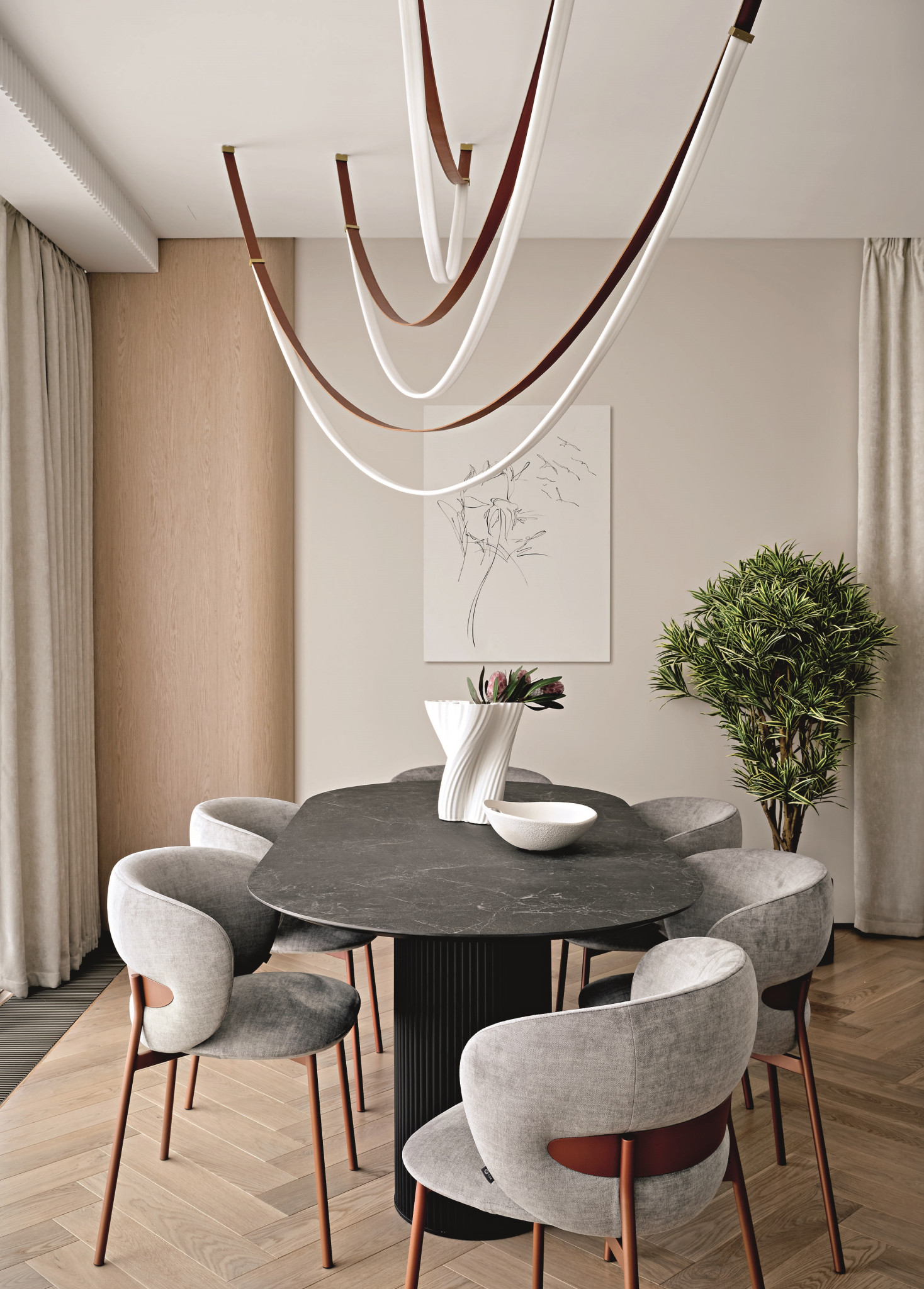 Бюро Bespoke работает в современном стиле, для которого очень важна функциональность. Поэтому дизайнеры старались сделать интерьер не только красивым и стильным, но и практичным. В свою очередь, contemporary дает большую свободу в стилевом и художественном выражении. В данном интерьере прослеживаются явные классические приемы — лепнина, молдинги, паркет в елочку. В то же время модные детали — трековые светильники, люстра с кожаными ремнями, скрытые двери в алюминиевых рамах, кварцевый агломерат с выразительным рисунком — создают ощущение актуального современного интерьера, который будет радовать хозяев и прослужит им долгие годы.