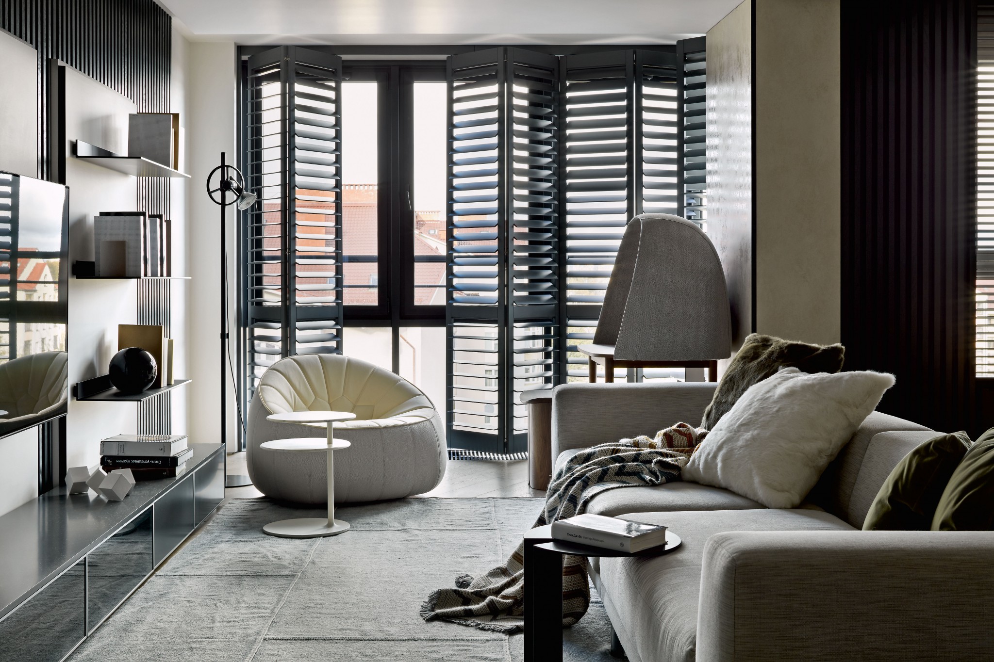 Строгий современный стиль этой квартиры в Калининграде автор проекта смягчила за счёт натуральных фактур и плавных форм мебели