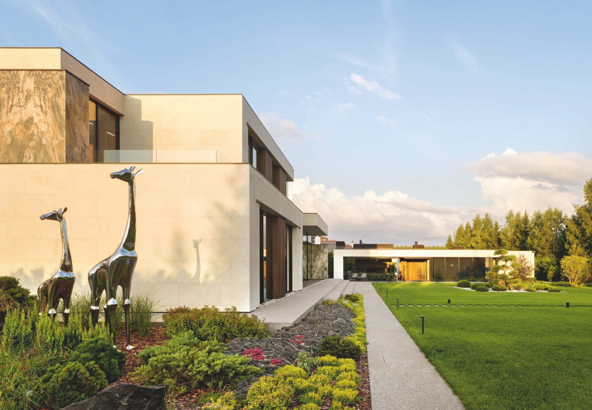 Эта загородная резиденция в подмосковном поселке на Новорижском шоссе, созданная с нуля, стала воплощением диалога архитектуры и ландшафта. Участок в 30 соток, граничащий с живописным парком, определил главную идею — ориентацию основных зон на юго-запад, где открываются виды на зелень. Здесь гармонично расположились основной дом площадью 700 квадратных метров и гостевой дом-баня со спа-зоной, гостиной с кухней и террасой с камином и барбекю. Технические же помещения, включая зону для персонала, обращены к северу. Архитектура зданий обрела форму благодаря продуманной связи пространств: каждое помещение служит продолжением другого, создавая единый ритм. Стилистика дома как снаружи, так и внутри пронизана мотивами Африки — теплой, солнечной и полной контрастов. Натуральные кварцит и известняк, украшающие фасады, плавно переходят в интерьер, формируя целостную эстетику. Особое внимание заслуживают монолитные плиты из кварцита высотой 3,2 метра — их сложный монтаж и редкий рисунок стали вызовом для команды, но результат превзошел ожидания, ведь далеко не каждый камень подходит для нашего климата.