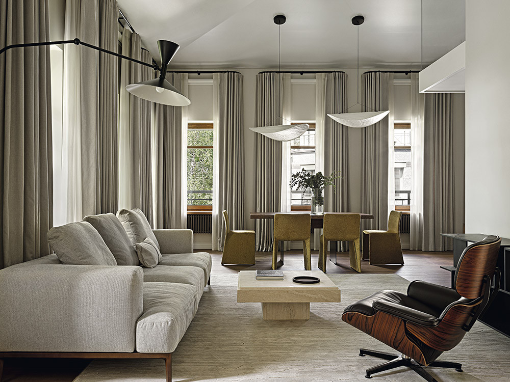 Анастасия Рыкова и Анна Денисова из дизайн-студии SPECIAL-STYLE оформили для своих давних клиентов квартиру в жилом комплексе на Каменном острове в Санкт-Петербурге. Высокие потолки и большое количество окон были безусловными достоинствами квартиры, но так как она была приобретена на вторичном рынке, то нуждалась в основательном ремонте. «Когда заказчики переехали в Северную столицу и приобрели здесь жилье, они пригласили нас поработать над интерьером своей новой квартиры. Запрос был скорее функциональным: разместить на приобретенной жилой площади просторную гостиную, спальню, кабинет, достаточное количество мест для хранения или гардеробную, — рассказывают авторы проекта. — Владельцы осознавали ценность большого внутреннего объема квартиры, и мы рады, что не пришлось их убеждать в необходимости оставить все возможное пространство максимально открытым. Нам очень повезло, что не было и желания делить на большое количество комнат — квартира предназначалась для жизни вдвоем». Следуя выбранной стратегии, за закрытыми дверьми спрятали только хозяйскую спальню и санузлы, при этом вход в спальню сделан через двойные раздвижные двери, что при желании позволяет объединить личную комнату с гостиной и кухней-столовой. Расположение квартиры в мансардном этаже со скошенным потолком дало возможность дизайнерам с выгодой использовать нестандартную высоту помещения — они организовали антресольный этаж, на котором расположились кабинет и гардеробная комната. Открытое пространство первого этажа имеет в плане П-образную форму и объединяет холл прихожей, гостиную, столовую и кухню — именно над ней расположилась лестница, ведущая на второй полуэтаж. Во входной зоне двери справа ведут в санузлы — гостевой и хозяйский, напротив них расположился вместительный шкаф для одежды и обуви, скрытый деревянной реечной «стеной». Из прихожей открывается вид на гостиную, раздвижные двери в кото - рой ведут в хозяйскую спальню. Гостиная-столовая очень светлая — высокие окна позволяют дневному свету беспрепятственно проникать в квартиру, а через стеклянные ок - на-двери есть возможность выйти на балкон. Особое внимание в гостиной привлекает печь-камин, над которым работала компания Royal Fire, изготавливающая камины по индивидуальным проектам. Непростая ситуация из-за скошенного потолка была и с разработкой дымоходной системы, но специалисты компании «Росстин»