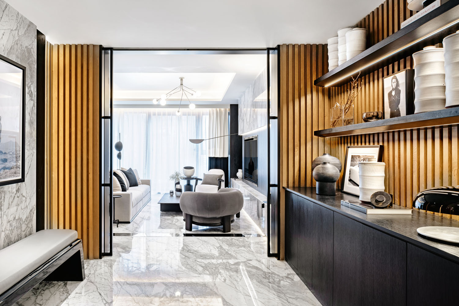 В одной из таких жилых башен находятся эти люксовые апартаменты, оформленные британским дизайнером Келли Хоппен (заказчиком выступил итальянский бренд TONINO LAMBORGHINI, активно инвестирующий в развивающийся Восток). Бюро Келли, Kelly Hoppen Interiors, реализовало немало проектов в Азии, в частности в Китае. Это и общественные пространства, и частное жильё. Так что дизайнер знает местную специфику. Вместе с тем она считает, что при всех