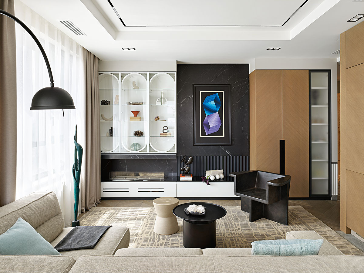 Авторы проекта твёрдо убеждены: идею любого интерьера формируют хозяева дома — их образ жизни, увлечения, привычки, вкус и стиль. Задача архитектора состоит в том, чтобы выразить все эти категории на языке дизайна и архитектуры. В распоряжении Екатерины и Надежды оказалась квартира с гармоничной изначальной планировкой — правильный прямоугольник, ряд высоких окон, удобное расположение технических систем. На этой основе легко складывалось планировочное решение. В нём нужно было учесть пожелания каждого из членов семьи, создать функциональное и уютное личное пространство. «Кухня–столовая, две детские, мастер–спальня и гардеробная — словно бусины разного размера и цвета, они «нанизаны» на центральную ось, вдоль которой тянется коридор», — рассказывает Екатерина. Объединяющим мотивом для всех помещений стала форма полукруга, арки. Он появляется и в качестве элемента для декора стен, как в комнате дочери, и в форме мебели и аксессуаров: линии стеллажа в гостиной поддержаны формой светильников в кухонной зоне и торшером в гостиной. «Когда мы уже работали над проектом, появилась задача вписать в проект специальное место для хранения коллекции декора, которую собирают хозяева. За основу мы взяли идею арки, соединили три полукруглых элемента, и у нас получилась композиция из навесных шкафов и подсветкой над камином. Это камин с настоящим, «живым» огнём,