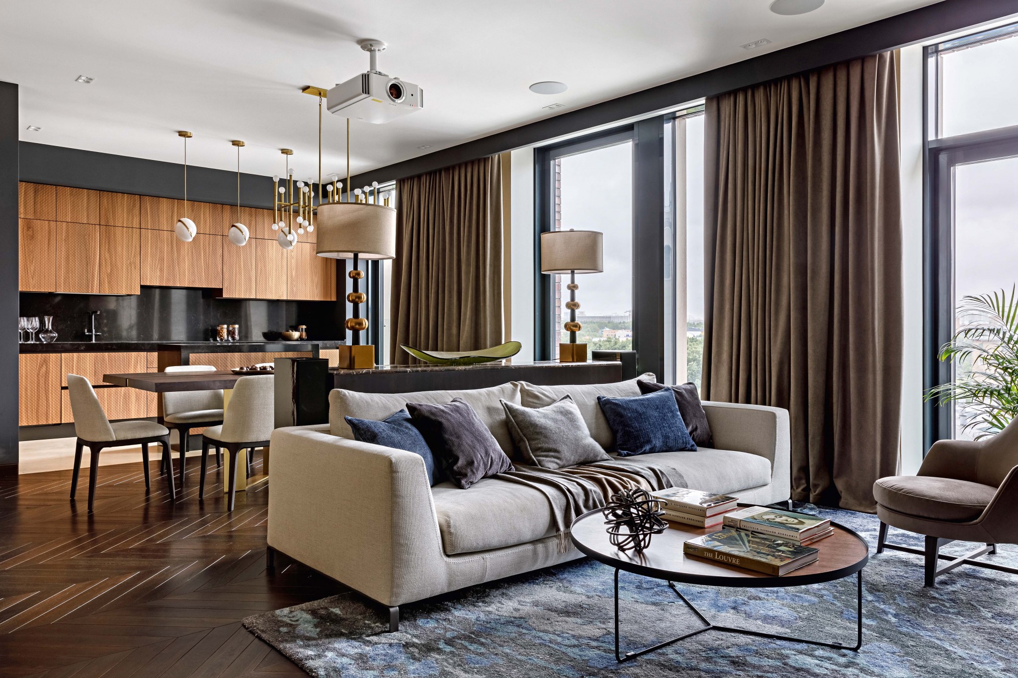 Пространство сложилось путём объединения двух квартир площадью 75 квадратных метров каждая в одну большую, просторную квартиру, учитывающую все потребности хозяев. Одну отдали под общественную зону, а во второй организовали приватный блок с двумя спальнями, двумя ванными комнатами и кабинетом. Благодаря панорамным окнам внутрь гостиной поступает достаточно света. Но чтобы свет проникал вглубь, во входную зону и в ванную комнату, дизайнер предложила зонировать эти помещения «прозрачными» стенами. Так, в прихожей появилась ажурная деревянная перегородка, в центре которой установлено двухстороннее зеркало, а в ванной хозяев — стеклянная перегородка. Проникающий через неё дневной свет делает пребывание в комнате по утрам ещё более приятным. Заказчики мечтали о современном респектабельном интерьере, и, чтобы показать, как пространство выглядит вживую, дизайнер пригласила супружескую пару посмотреть уже реализованный проект в схожей стилистике. «Когда показываешь живой интерьер и рассказываешь о всех нюансах непосредственно на месте, это производит сильное впечатление,—говорит Ася.—Хозяева своими глазами увидели, как картинки в альбоме превратились в готовый интерьер, красивый, продуманный и удобный. Заказчик тогда мне сказал: «Теперь я уверен, что мы в надёжных руках: Вы сможете воплотить в жизнь все свои смелые идеи даже лучше, чем это выглядит на 3D–эскизах». Для меня это был самый приятный комплимент, появилось желание сделать ещё лучше. И самое интересное, интерьер на сто процентов повторяет то, что было изначально задумано, и этому я несказанно рада. Во время съёмки интерьера я попросила фотографа снять ракурсы, которые были на визуализации,