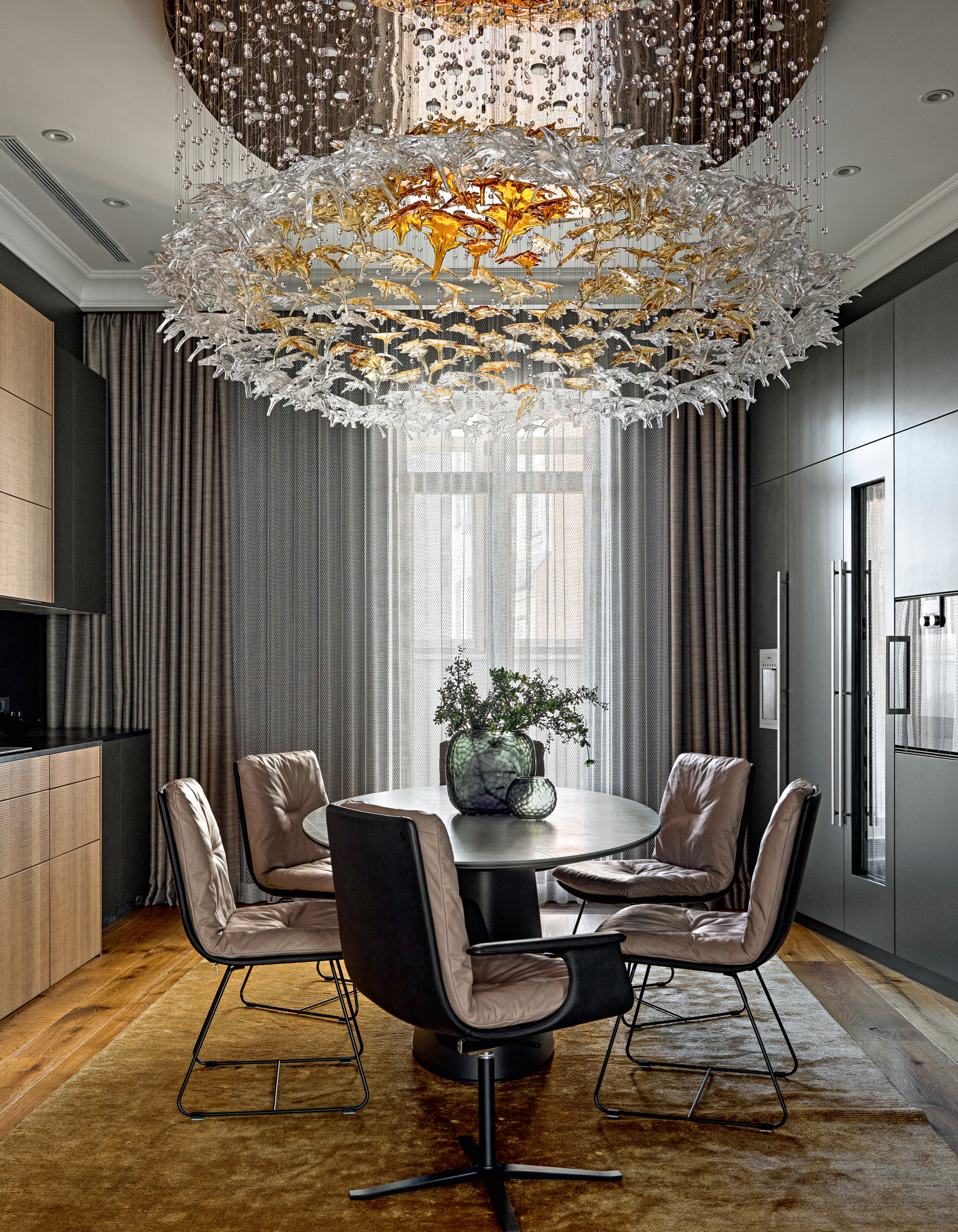 Юлию Орлову вдохновила эта история. Она создала гармоничный интерьер, утончённый и комфортный одновременно. Стилистика базируется на принципах неоклассики, однако «наполнение» — современное. Окна в пол, высокие карнизы, роскошные люстры и современная по стилю мебель — здесь считывается история в духе парижской квартиры, и это оммаж первому владельцу дома — французу Камиллу Филиппу