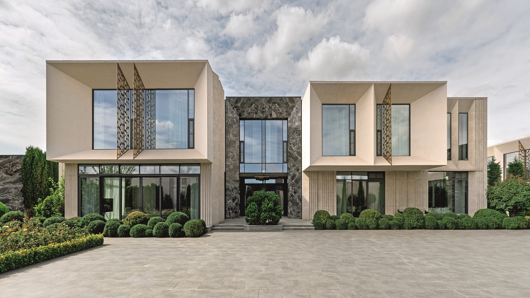 Лаконичный и в то же время яркий облик дома складывается из многих составляющих: интересной пластики фасада с роскошным центральным порталом и выразительным выносом второго этажа, из игры текстур бразильского гранита, которым отделан портал фасада, из продуманной сценографии зоны въезда. «Ворота — это первый архитектурный жест дома, — рассказывает архитектор Оксана Волкова. — Они не просто закрывают территорию, но создают ощущение ожидания, задают уровень». Торжественный портал ворот из гранита и стали с изящной лазерной резкой и золотистым покрытием задает тон всему ансамблю. За воротами перед гостем открывается гармонично организованная территория, где здание основного дома площадью 1200 квадратных метров, дом приемов в 500 квадратных метров, бассейн, сад и площадки для проведения праздников смотрятся как единый ансамбль. Въезд ориентирован на центральную ось дома и ведет прямо к главному входу. Каменный портал главного входа высотой двенадцать метров и центральная клумба с хвойным ниваки усиливают общее ощущение от въездной группы и от всего ансамбля в целом.