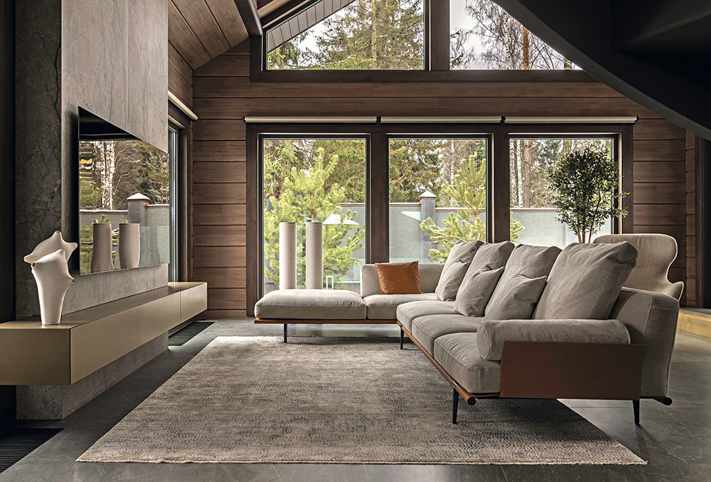 Гостиная. На фоне стен из бруса элегантно смотрится конструкция под ТВ-панель в отделке керамогранитом (Porcelanosa) и подвесная консоль с бронзовыми фасадами. Диван Poltrona Frau, мягкий и с высокой спинкой, и поворотные кресла Poliform словно приглашают к отдыху. Ковер, Dovlet House