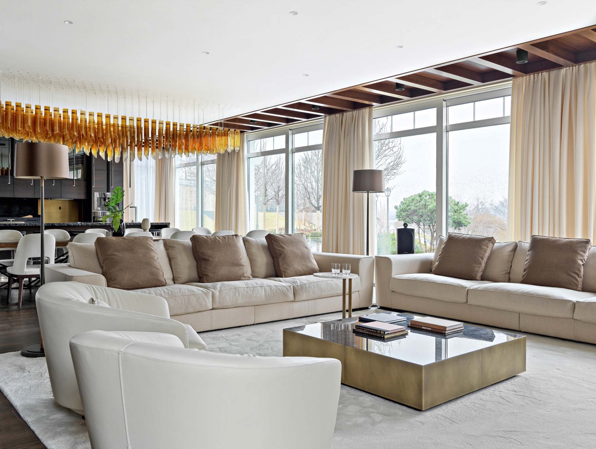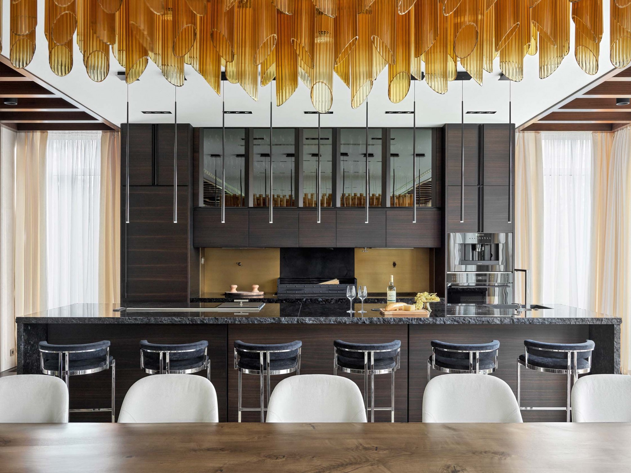 Заказчик поручил Елене разработать интерьер гостевого дома, основной функционал которого планировался как ивент–пространство. Именно поэтому большую часть площади архитектор отдала под просторную общественную зону. Помимо гостиной с мягкой диванной группой здесь есть столовая с большим столом на шестнадцать человек, кухня с казаном, настоящим дровяным мангалом и даже тандыром. Раздвижные окна–перегородки в пол с трёх сторон помещения наполняют пространство светом и при необходимости превращают гостиную в уличную беседку, откуда можно выйти на открытую террасу у воды. «Основные центры притяжения в доме — два «очага»: камин и мангал, — поясняет автор проекта. — Мы расположили их напротив друг друга, на фронтальных стенах, подчеркнув таким образом их главенствующее положение. Обеденный стол — ещё одна значимая деталь в интерьере. Он выполнен по нашему проекту. Для его создания использовали спилы из ствола карагача длиной более пяти метров. Как оказалось, ствол такой длины — большая редкость, и мы его искали почти полгода».