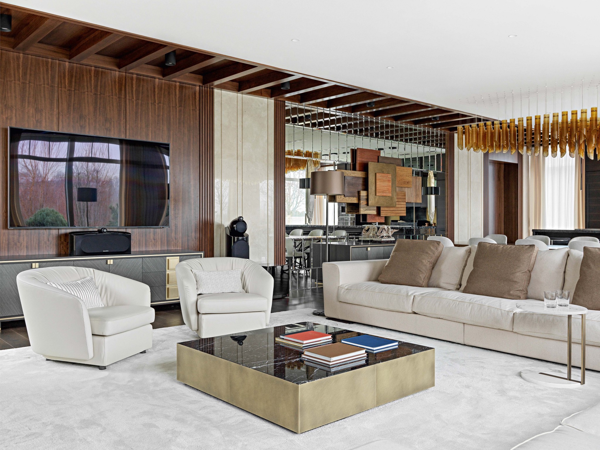 В оформлении использованы дорогие, статусные марки мебели, натуральные, природные материалы и приятные фактуры, которые создают, с одной стороны, атмосферу отдыха, а с другой — динамичную среду для домашних праздников. Пол в гостиной и спальне выложен паркетной доской из тонированного дуба, в холле и коридоре —мрамором с инкрустацией из латуни. Стены декорированы деревянными буазери и рельефными наборными панелями из мрамора, а потолок — деревянными панелями и балками. Пристальное внимание архитектор уделила тактильности предметов. Это мягкие и уютные обивки мебели, ковры, тёплые поверхности дерева, к которым приятно прикасаться. В свою очередь натуральный гранит с колотым краем и холодные гладкие поверхности мрамора привносят в интерьер эффектный контраст. Стилистика пространства в меру современная с налётом лоска и респектабельности выбрана не случайно, ведь по заданию заказчика гостевой дом должен был стать логическим продолжением основного дома как во внешнем облике, так и во внутреннем. «У хозяев довольно часто бывают гости: партнёры по бизнесу, медийные личности,— замечает Елена.— Шумные и весёлые застолья могут помешать маленьким детям, поэтому заказчик решил создать отдельное пространство, позволяющее отдыхать и детям, и взрослым, не мешая друг другу. Даже несмотря на некую функциональную легкомысленность дома, мы старались сделать всё, чтобы интерьер соответствовал статусу хозяев».