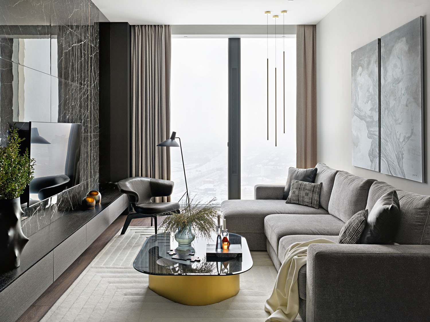 Знакомство Антона Петрова с заказчиками состоялось в инстаграме (соцсеть признана в РФ экстремистской и запрещена). Молодая супружеская пара занимается бизнесом, ведёт активный образ жизни. Детально обсудив с хозяевами все задачи и цели, архитектор остановился на концепции статусного, стильного и функционального интерьера, всецело отвечающего уровню места, в котором находятся апартаменты, — престижного жилого комплекса бизнес-класса Neva Towers в Москве.