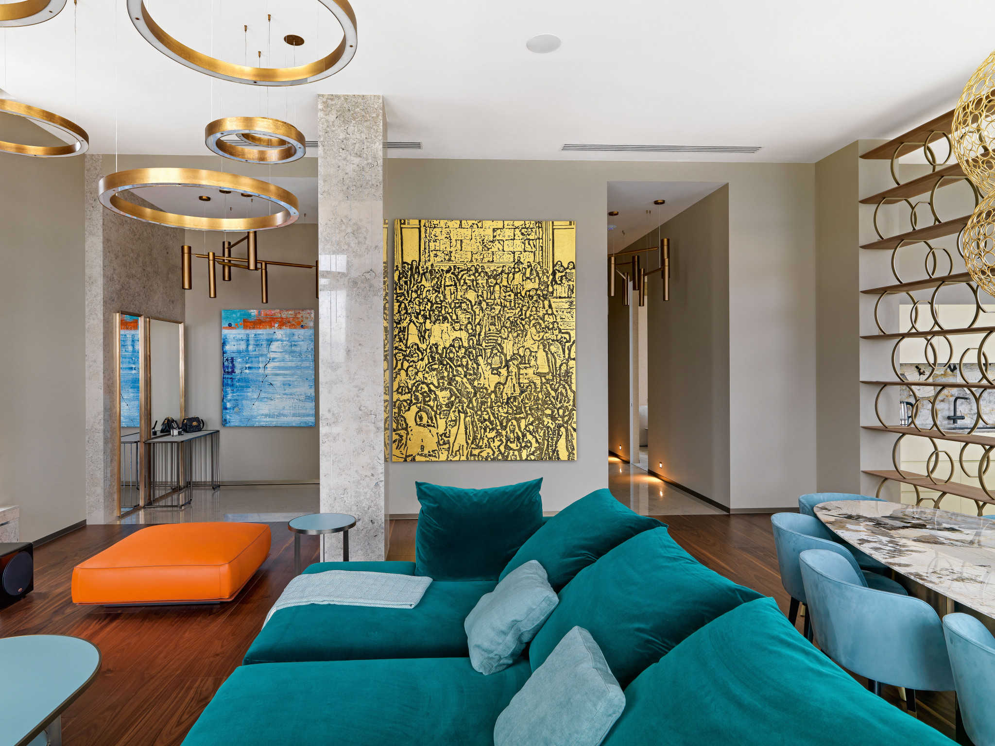 Молодая супружеская пара живёт в загородном доме, а эти апартаменты — на случай, если пришлось ненадолго задержаться в Москве. У супругов были разные интерьерные предпочтения: минимализм и мягкий вариант ар–деко. Авторы проекта предложили стиль, который устроил обоих, — актуальный сегодня софт–минимализм. Все основные помещения оформили в этом ключе, лишь в приватной части квартиры сделали реверанс ар–деко: это тканевые панели и зеркальные фризы в хозяйской спальне, а также золотые «зонтики» люстры CATTELANI&SMITH.