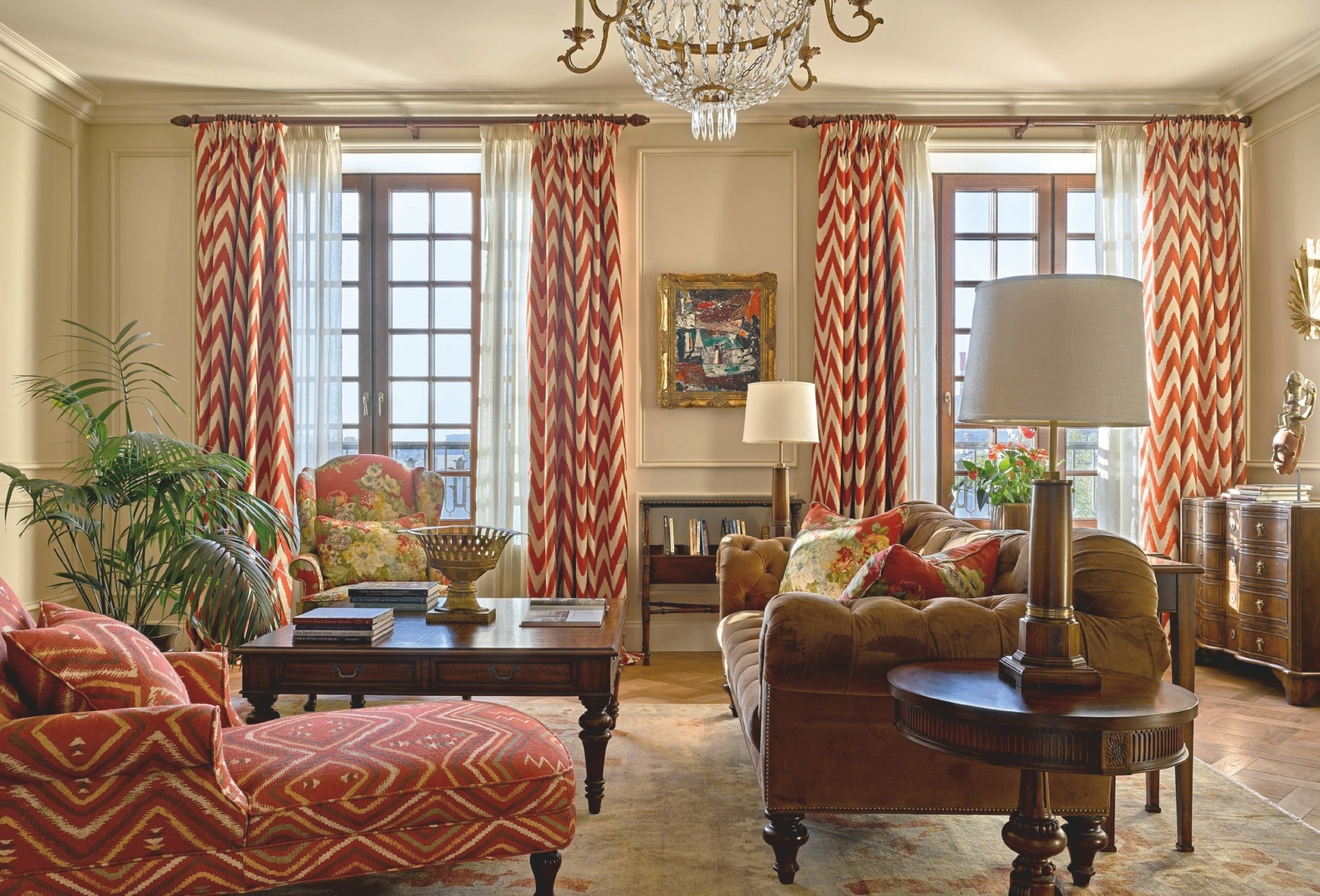 Рассказывает Мария Данелия: «Наша любимая стилистика — английская классика. За долгие годы выработались определённые принципы, приёмы, которым мы неизменно следуем, сложился некий авторский почерк. Но время не стоит на месте, меняется мир, появляются новые стандарты красоты. Поэтому нам захотелось внести свежую струю в традиционный образ, сделать его менее сухим и статичным. В первую очередь изменения коснулись орнаментов, узоров, их масштабов, а также цветовой гаммы». Если раньше дизайнеры использовали приглушённые, словно припылённые оттенки, то на этот раз в ход пошли более яркие, сочные тона и насыщенные контрастные сочетания. Основным декоративным приёмом стал укрупнённый масштаб. Цветочные ли орнаменты обивки, потолочный карниз, рисунок ковра, членение стены молдингами или плинтус — всё крупнее, чем обычно, больше, выше, шире, чем раньше. Намеренно крупный узор сбивает ритм, делает пространство более уютным. «Сначала мы купили «ушастое» кресло, обитое тканью RALPH LAUREN HOME с классическим цветочным рисунком, — продолжает Мария. — Нам понравилось, что рисунок более крупный и контрастный, это уже не та «ситцевая» английская