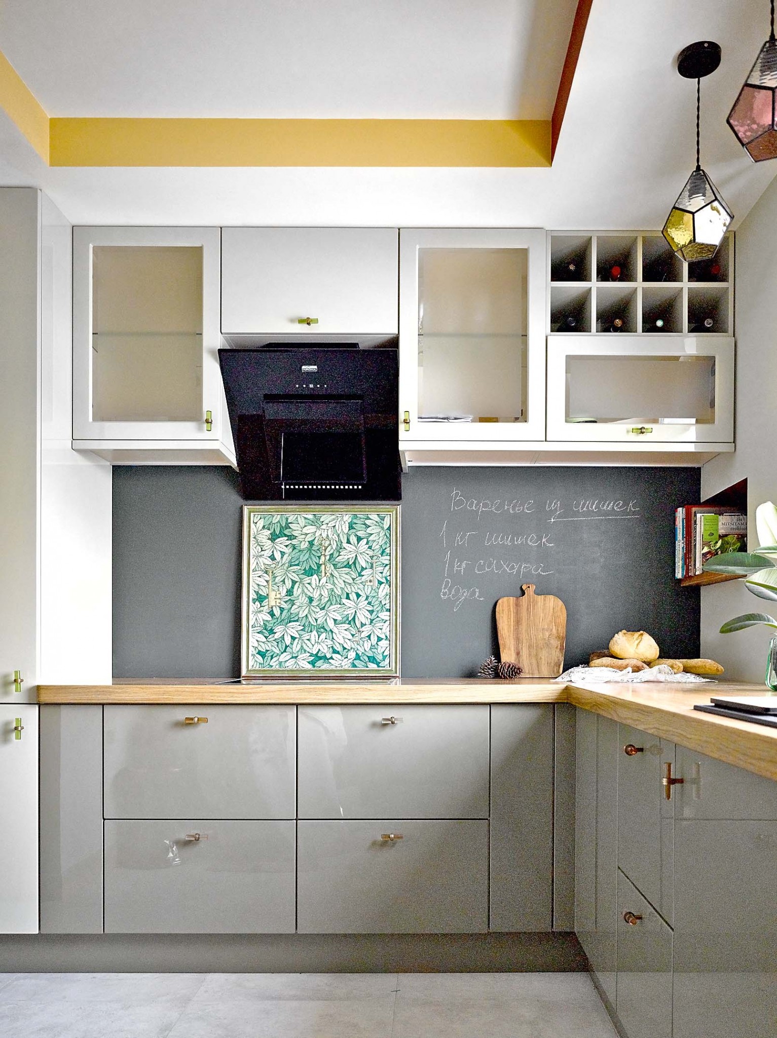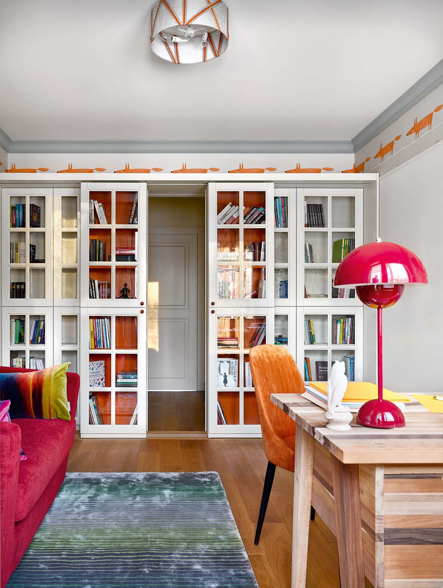 В результате получилась комфортная четырёхкомнатная квартира с гостиной–столовой, двумя спальнями и кабинетом. Водоразделом служит холл, куда попадаем из небольшой прихожей. В нём — четыре двери. Дверь справа ведёт в гостиную–столовую, слева — в кабинет. Две двери прямо по курсу — в спальни. Уже помещение холла задаёт тему волшебного леса, которая по-разному будет проявлять себя в разных помещениях: сдержанно, на нюансах, звучать в зоне гостиной, встречать образами сов в столовой и детской, а в спальне хозяев развернётся в полную силу: обои по дизайну Форназетти в изголовье кровати служат главным декоративным акцентом. В кухне встречаем изящный отголосок этой темы: те же обои, но уже под стеклом в раме, в виде постера — в качестве экрана у плиты. Вообще, здесь много символов, загадок, постмодернистской игры. Это очень личное пространство, удобное прежде всего для его обитателей. Чего стоит, например, стена, окрашенная магнитной краской: прямо на ней рождаются сценарии. Или библиотека, сквозь которую, как в английском замке, есть тайный ход в другое помещение. Как его найти? Совы подскажут.