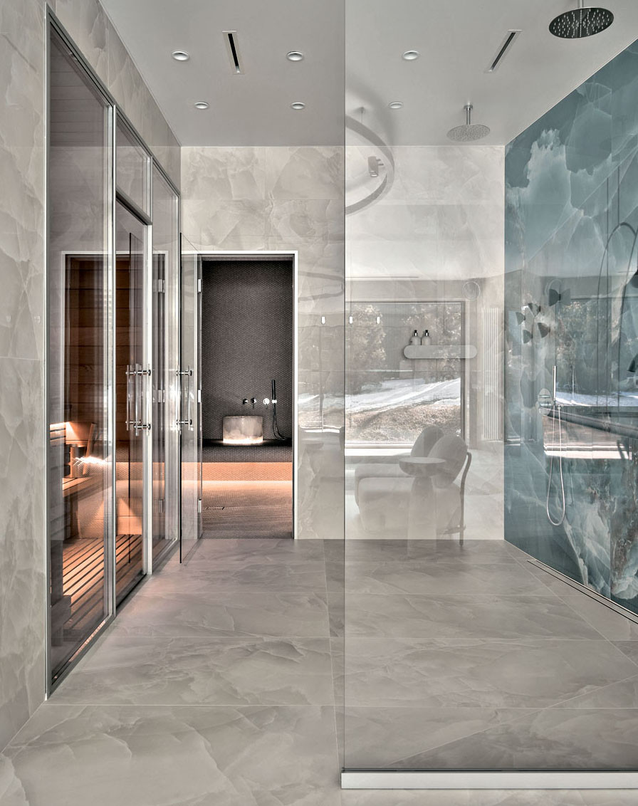 Спа-комплекс располагается в цокольном этаже. Слева — сауна, прямо — хаммам. Душевая зона оформлена керамогранитом глубокого сине-изумрудного оттенка, напоминающим потрескавшийся лед Байкала. В сауне — белая печь, подчеркивающая светлую гамму интерьера, а в хаммаме — круглая мозаика и потолок со встроенным оптоволокном, имитирующим мерцание звезд. Подсветка может менять оттенки: от холодного синего до нежного розового или нейтрального белого. Завершает образ раковина из прозрачного оникса с нижней подсветкой