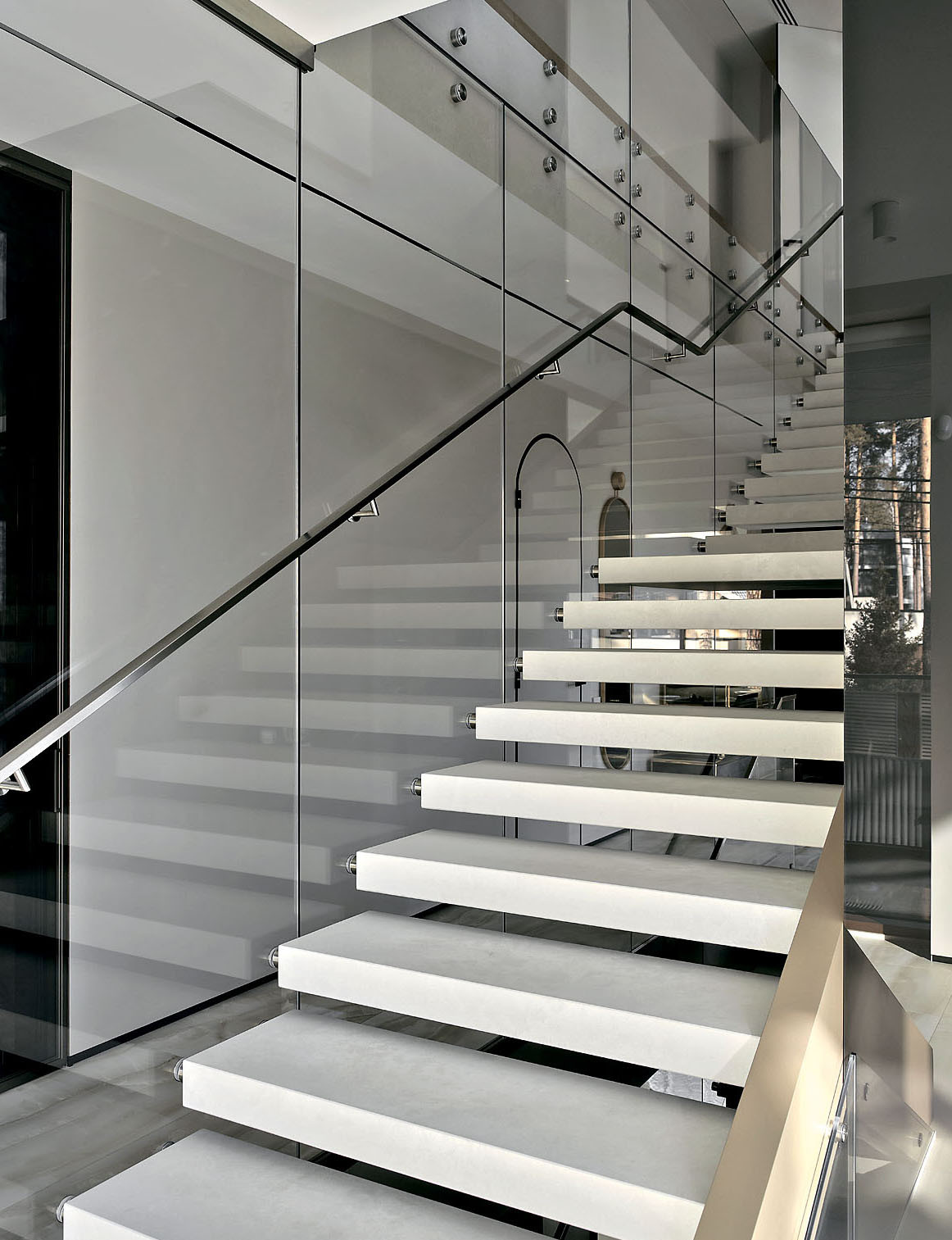 Ограждение лестницы сделано из ультрапросветленного стекла без тонировки, поэтому лестничное пространство выглядит максимально большим и открытым вовне. Камень ступеней (кварцевый агломерат) матовый, его фактура похожа на фактуру декоративной штукатурки. Этот материал не берет на себя слишком много, а лишь деликатно дополняет более «активные» материалы отделки — керамогранит под оникс и дерево