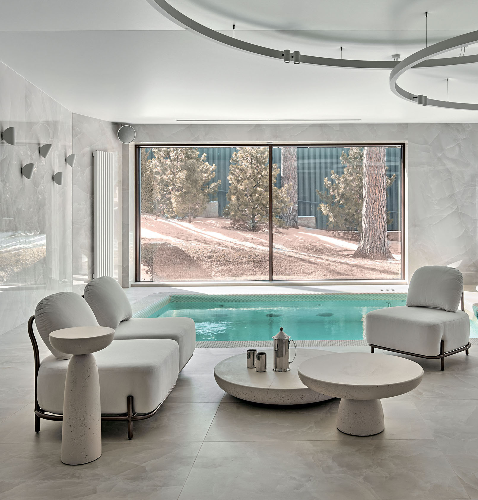 Бассейн в цокольном этаже дома. Стены и пол отделаны керамогранитом под оникс нейтрального светлого оттенка. Округлые светлые кресла напоминают по форме валуны. Им вторят круглые столики (Mogg) нейтрального молочно-белого оттенка
