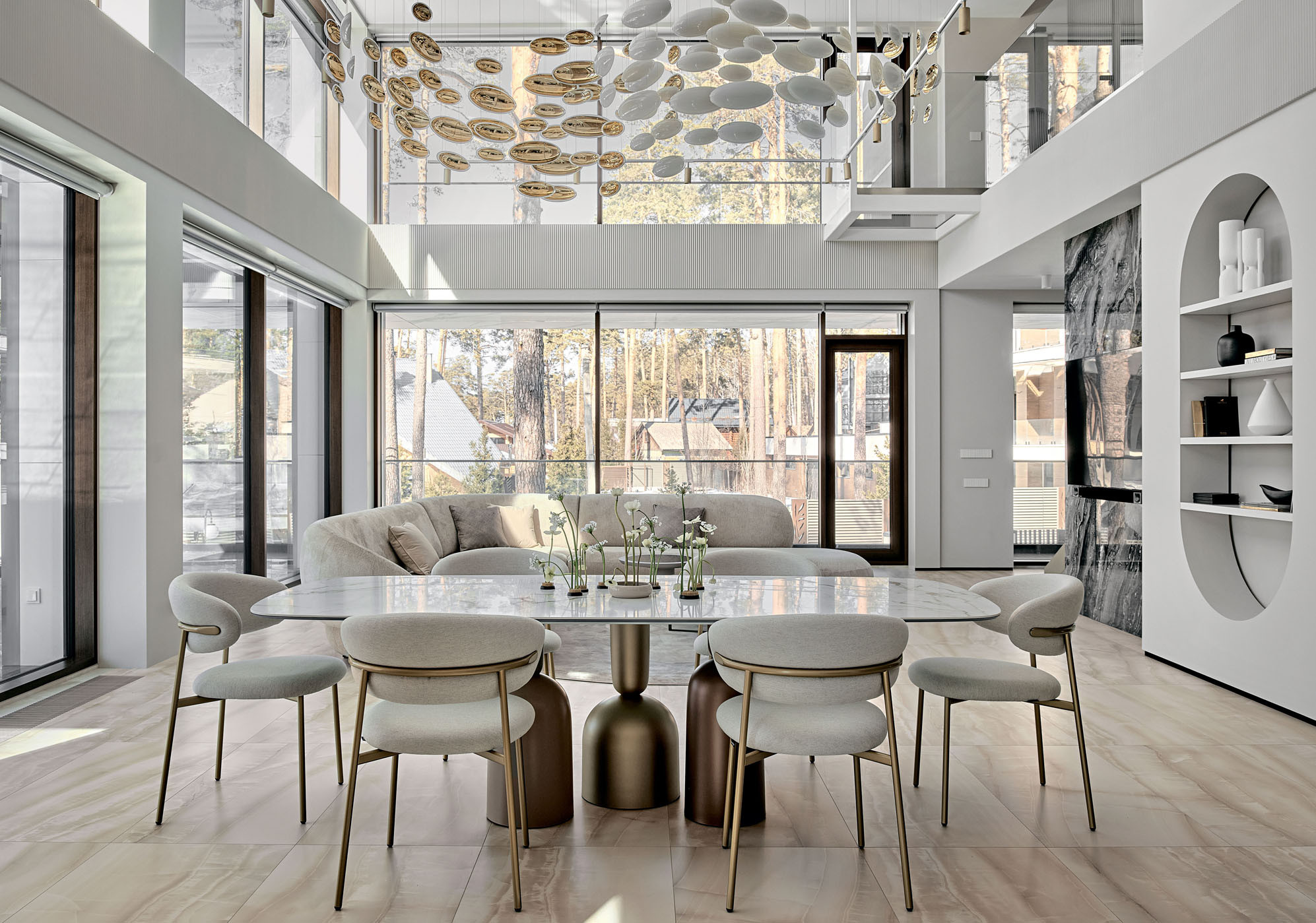 «Нам повезло, — говорит дизайнер, основатель design studio Galitarova, — мы подключились на стадии «коробки» здания, где еще даже не были сделаны отопление, вентиляция, сантехника, поэтому мы взяли эту часть проекта под свой контроль. Попав впервые на объект, мы обнаружили, что, заходя из гаража в дом, негде разместить одежду, поставить сумки, только лестница и дверь в спа-комплекс. Я предложила достроить функциональную входную группу, отняв немного пространства у гаража. Так в цокольном этаже появилась своя прихожая, где разместили шкаф для верхней одежды, консоль с банкеткой и зеркало в пол». Из прихожей, поднявшись по лестнице, хозяева оказываются на первом этаже, в огромном пространстве гостиной со «вторым светом» и сплошным остеклением. Такой контраст производит сильное впечатление. Парадный гостевой вход расположен в другой части дома, и виды, раскрывающиеся перед гостем с этой стороны, не менее эффектны.