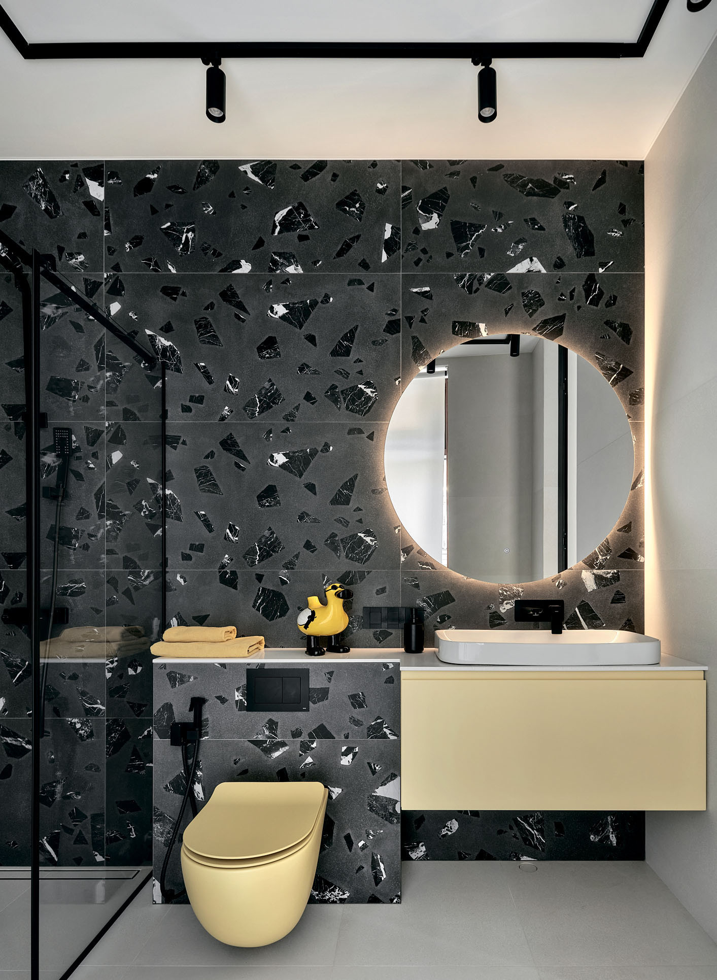 Душевая первого этажа. «Я люблю цвет в интерьере, — говорит Вера Галитарова. — Здесь, например, унитаз и тумба пастельно-желтого оттенка, это яркие акценты на фоне темной стены. Высота инсталляции гораздо ниже, чем стандарт, так как мы хотели сделать функциональную поверхность рядом с раковиной, чтобы можно было поставить дозаторы для мыла, зубные щетки, разложить полотенца»