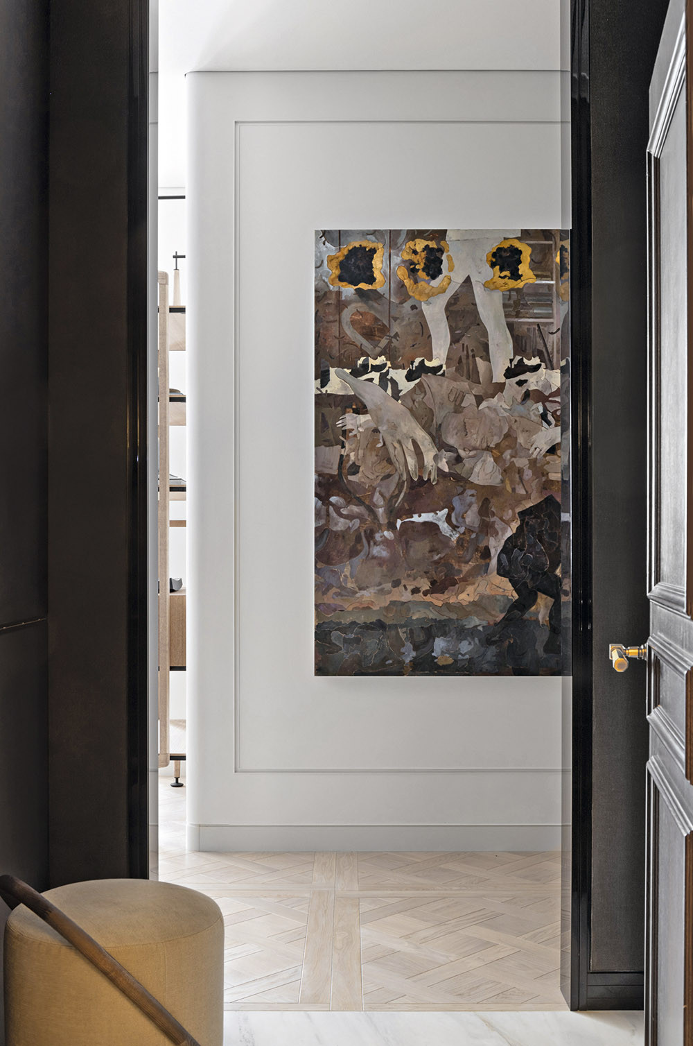 Винтерьере авторы проекта отразили образ города на Неве, переосмыслив его в контексте современности. «Базовая концепция объединяет эстетику классических мотивов и минималистичных, — объясняет Андрей Юдин, — и это придает современное звучание традиционным классическим элементам. Так, например, стеновые панели с теневым швом по периметру заменяют здесь классические гипсовые филенки.