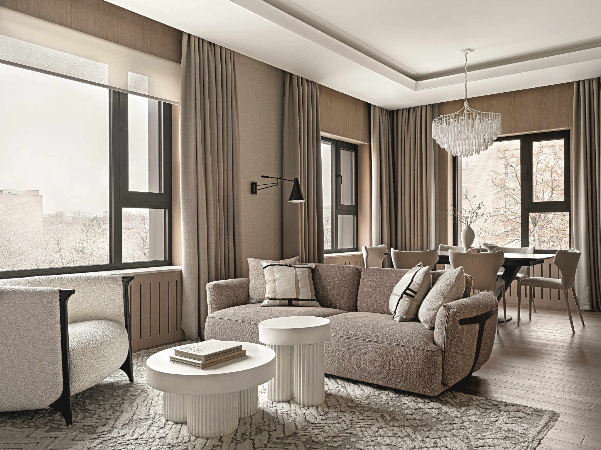 За окнами — конструктивистская архитектура, а в интерьере — чистые, строгие линии, сдержанные оттенки, текстуры натурального дерева и много естественного света, который создает мягкую, комфортную атмосферу. Этот практически монохромный интерьер, построенный на тонких сочетаниях белого, светло-бежевого, серебристо-серого, смотрится особенно утонченно, когда за окнами зима. Он сам напоминает зимний пейзаж.