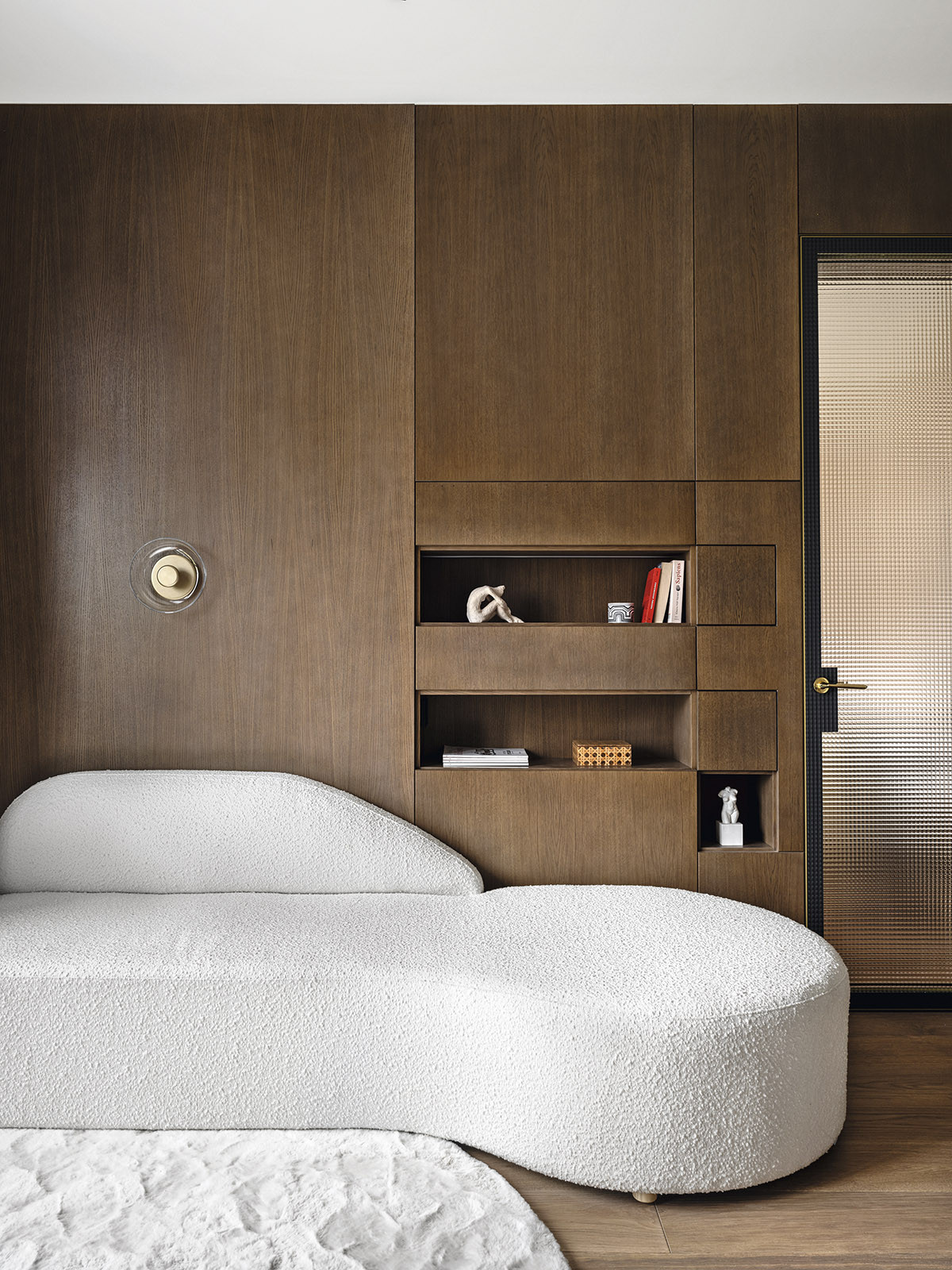 Кухня–гостиная имеет функциональное зонирование: пространство перед французским балконом занимает эргономичный диван, напротив него и за ним — стеллажи с открытыми нишами для книг и предметов коллекционирования; ближе к прихожей — компактная, но очень функциональная кухня. «Так как дом новый — он сдан в эксплуатацию в 2021 году, — у него ещё будет осадка. Мы учли это при выборе отделочных материалов. Например, стены гостиной отделаны шпонированными панелями и натуральными обоями из жаккарда и шёлка. Стена, разделяющая дневную зону и спальню, очень функциональна: по сути это встроенный стеллаж — в нём сочетаются скрытые за дубовыми фасадами системы хранения и открытые полки для предметов искусства», — рассказывает о проделанной работе Мария. В спальне важно было создать атмосферу безопасности, уюта и гармонии.