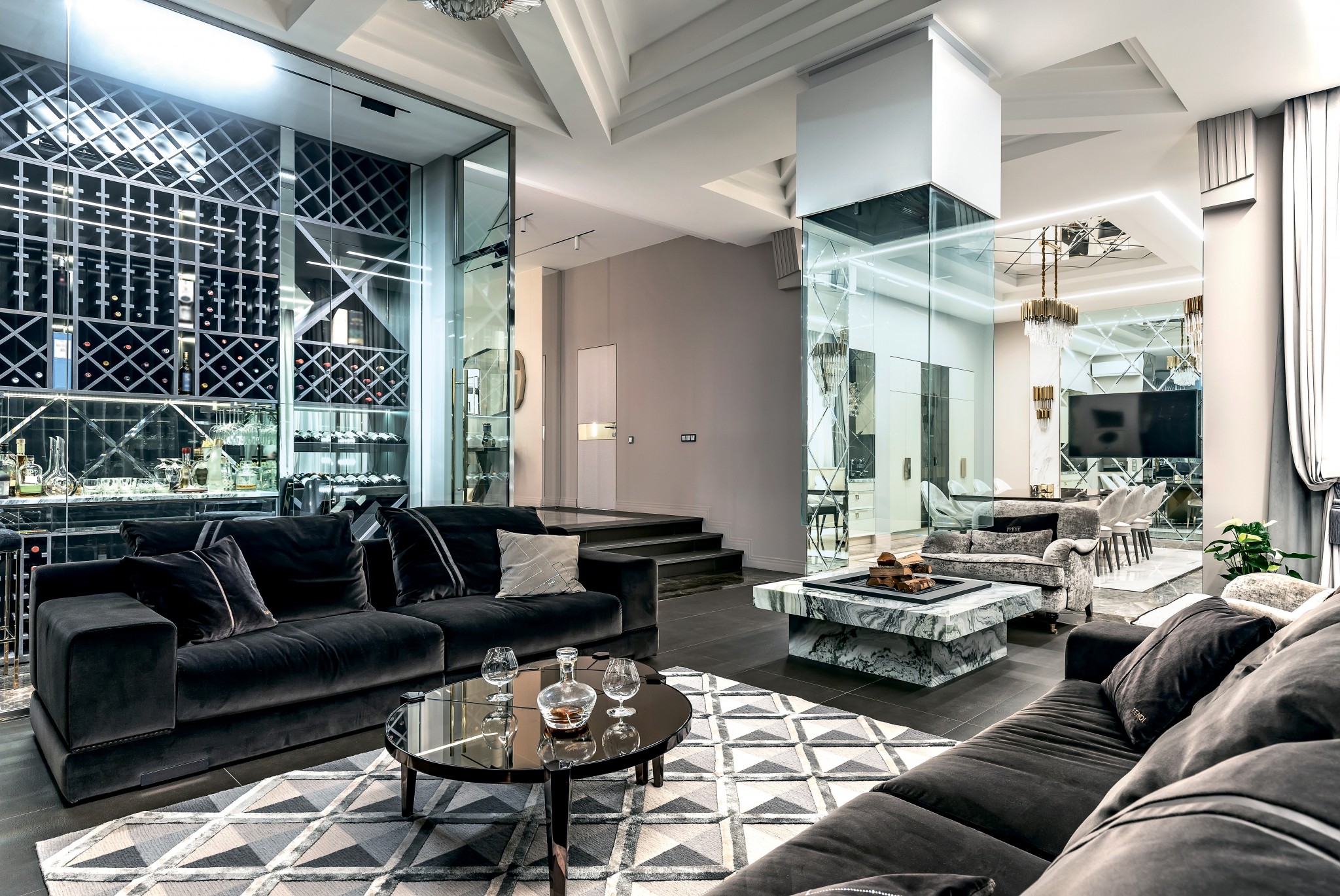Заказчики — дружная семья из пяти человек. Супруги обратились к архитектору Виталине Пахомовой с пожеланием создать в доме интерьер, который производил бы ошеломляющее впечатление, при этом хотели увеличить площадь так, чтобы было множество зон для совместного отдыха, а также у каждого члена семьи были свои спальня, гардеробная и санузел. «Были выполнены десятки вариантов планировочных решений, причём абсолютно разных, даже с выносом некоторых помещений в отдельное здание на территории участка, — замечает Виталина, — пока мы не пришли к одному единственному, самому оптимальному и функциональному». В соответствии с ним надстроили третий этаж, где оборудовали зону для отдыха с просторным кинотеатром, кабинетом и комнатами для гостей. До этого предварительно усилили все несущие конструкции и фундамент, по всему дому появились колонны и балки, которые придали пространству необходимую «ардекошную» симметричность, но сохранили высоту потолков. Первый этаж вместил гараж, спа–зону с сауной, бассейном, душем «впечатлений» и подвесными качелями, прихожую, гардеробную, холл, спортзал, столовую, парадную и рабочую кухни, гостевой санузел, гостиную, совмещённую с винной комнатой. «Хозяин дома коллекционирует вина, — отмечает Виталина. — Поэтому я спроектировала для него панорамную винную комнату с соответствующим температурным режимом и сделала её центральным элементом интерьера общественной зоны. В гостиной, которая изначально имела второй свет, мы создали перекрытие. Здесь на втором этаже возле панорамного окна установили лестницу на третий этаж. Это было непростым конструктивным решением, но оно того стоило. Лестничный холл оказался невероятно светлым, воздушным, с «парящей» лестницей из стекла и полированной нержавеющей стали». Интерьер по характеру получился