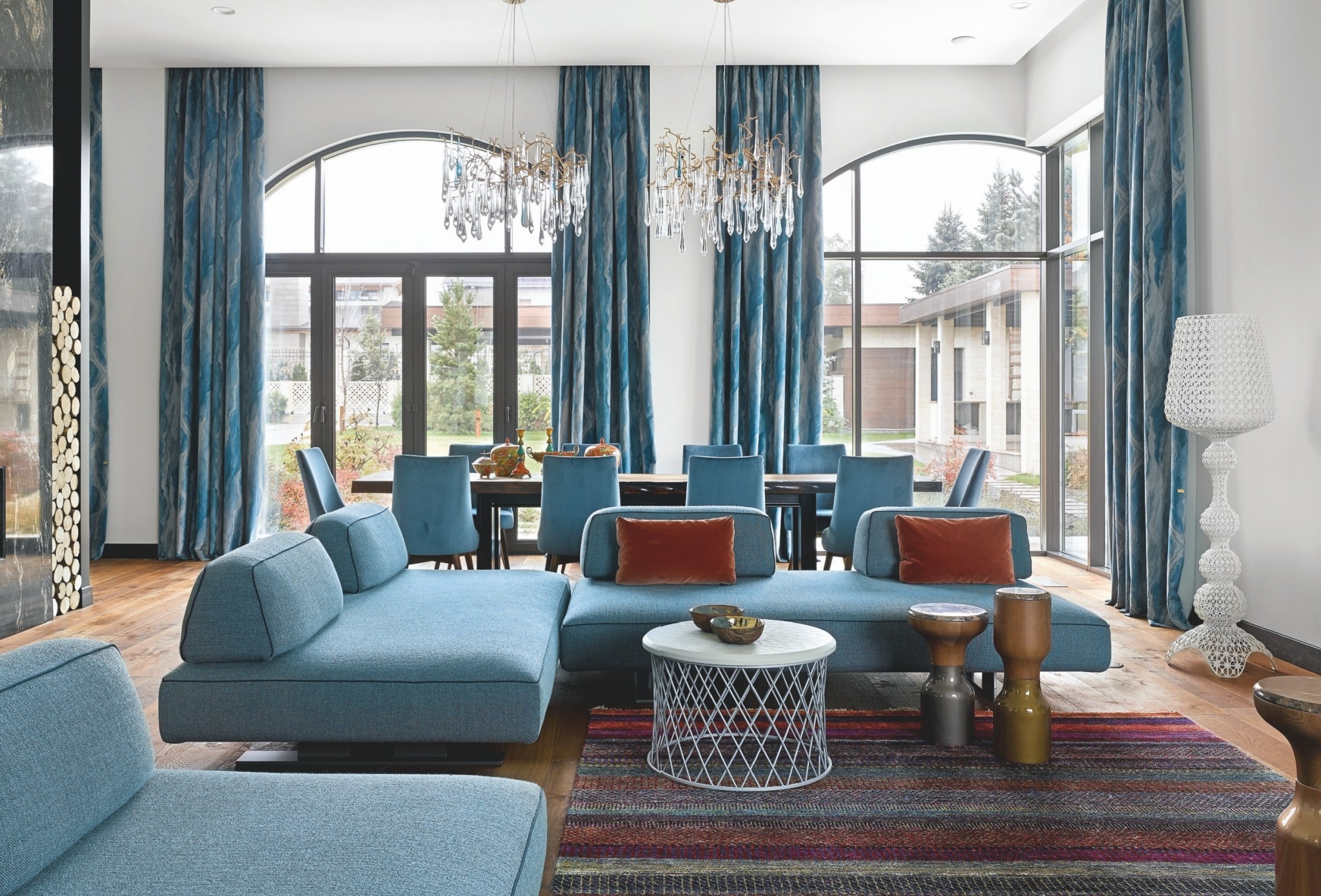 После рождения в семье пятого ребёнка заказчики поняли, что старый дом стал маловат, и они задумали построить новый, более просторный. Дизайнеры Алина Прибылова, Диана Беспаева и Наталия Малова подключились на этапе утверждения архитектурного проекта, поэтому смогли принять непосредственное участие в планировке внутреннего пространства. Высокие потолки, много окон, большие пространства были заложены изначально, так как заказчикам хотелось больше воздуха и света, чем было в предыдущем доме. Важным техническим элементом стала потолочная панельная система отопления и вентиляции. «Благодаря современнейшей системе от немецкой компании ZENDER мы обошлись без конвекторов и батарей под окнами, — поясняет Алина Прибылова. — Это существенно облегчило пространство, улучшило его в эстетическом плане, так как все коммуникации проложены в потолках, а регулировка температуры производится в каждой комнате с пульта управления». Авторы проекта не оставили без внимания любовь хозяев к восточному стилю, но предложили осовременить его, создать лёгкий, светлый интерьер с элементами Востока. Так в доме появились резные комоды, привезённые заказчиками из Арабских Эмиратов, мандала, подаренная друзьями, обои с экзотическими перьями, люстры с необычными кристаллами и самый восточный элемент дизайна — фонтан при входе в дом. «В этом доме много авторских идей, которые придумывались и дорабатывались уже в процессе, — вспоминает Диана Беспаева. — Например, идея с фонтаном пришла в голову уже при реализации. Мы с заказчиками понимали, что тут должно быть что‑то интересное, так как первое, что видит входящий, — это холл. Большая керамическая ваза необычной фактуры и глубокого синего цвета, наполнен-ная водой, украшает пространство, а журчание воды успокаивает, расслабляет».
