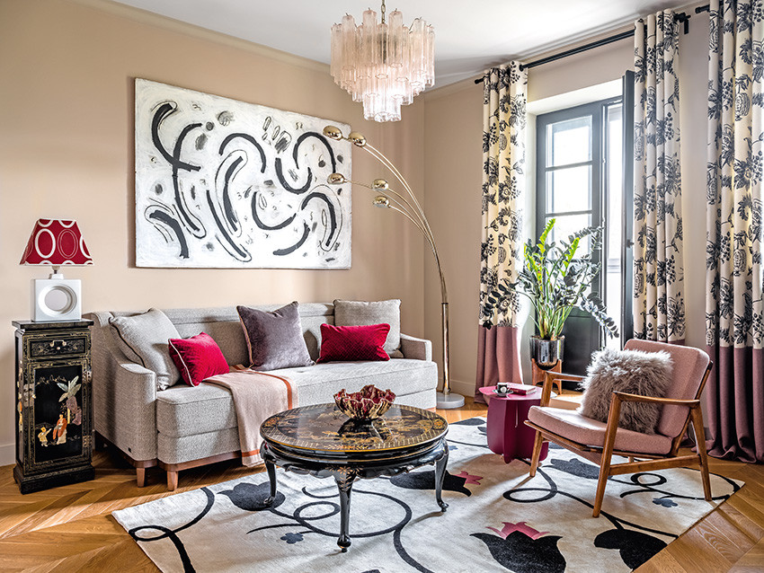 Квартира находится в старом жилом фонде Москвы, дом был построен в 30‑е годы ХХ века. Такой контекст усиливает очарование эклектичного интерьера с элементами винтажа, который создала Наталья Логинова для своей заказчицы, молодой успешной девушки, руководителя направления в крупной отраслевой компании. Хозяйка — человек разносторонне одарённый, увлекается искусством и архитектурой, пишет маслом картины. Она видела свой интерьер современным, комфортным, изящным и несколько богемным. У хозяйки уже была коллекция современной живописи, которую надо было правильно разместить в интерьере. В результате большая авангардистская картина заняла главное место в гостиной и задала «направление» орнаментам текстиля и атмосфере в целом. В квартире две комнаты: гостиная и спальня. (Есть и отдельная гардеробная.) Заказчица хотела объединить гостиную и кухню, но реализовать это желание не позволяли требования по эксплуатации помещений с газификацией. Нашли компромисс: кухню и гостиную разделили проёмом с распашными дверями. Они застеклены,