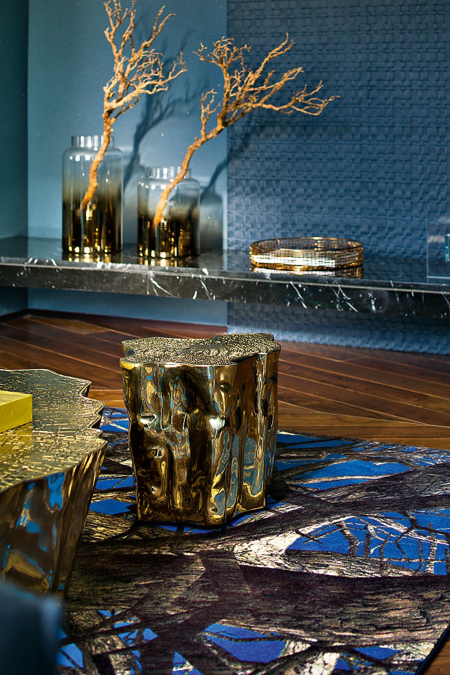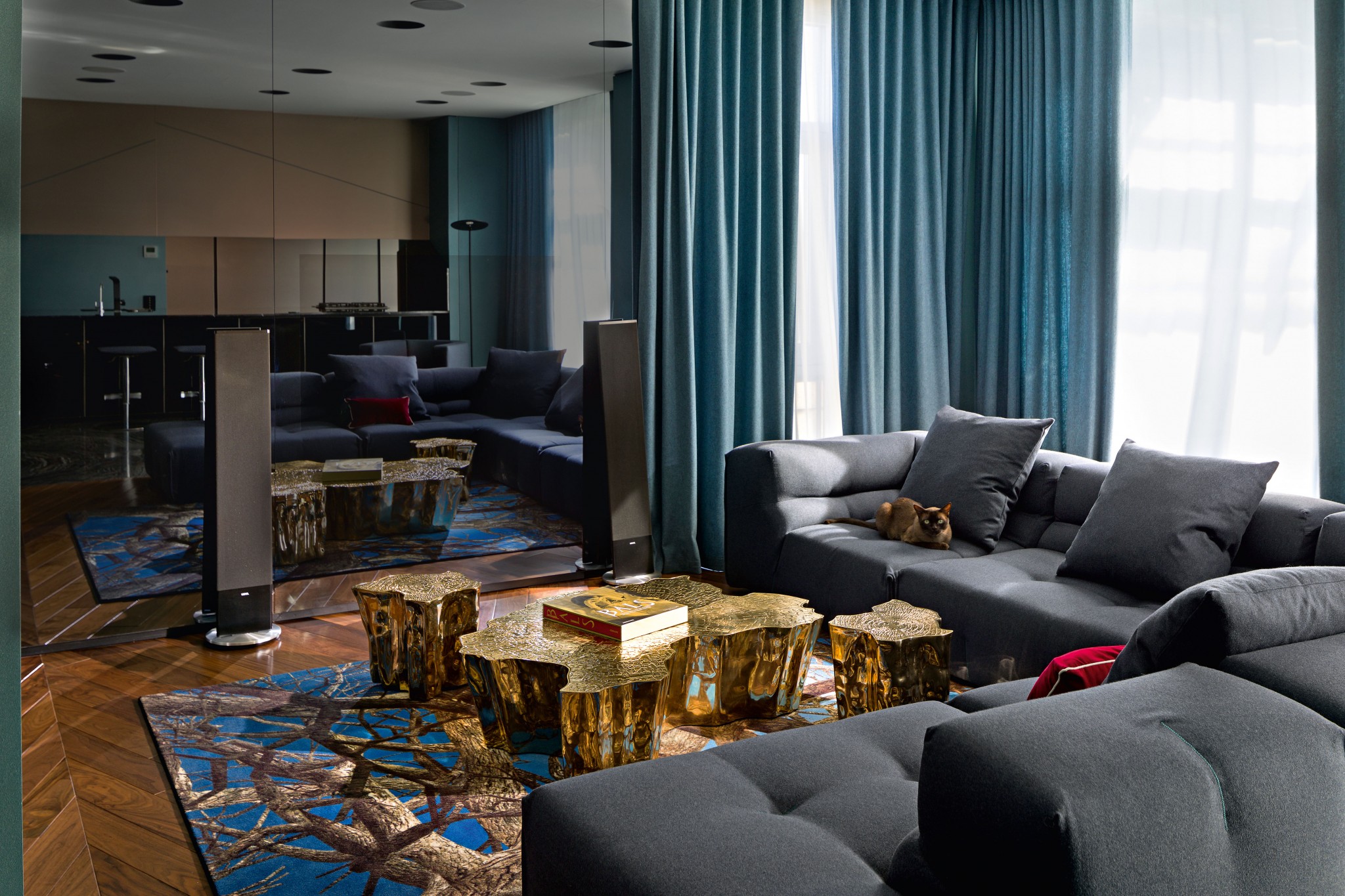 Гостиная организована по принципу студии: кухня и столовая являются частью общественного пространства. Широкий угловой диван (B&B Italia) стоит напротив зеркальной стены, в которую вмонтирован телевизор, невидимый в выключенном состоянии. Столики– пеньки, Boca do Lobo. Ковёр, Moooi