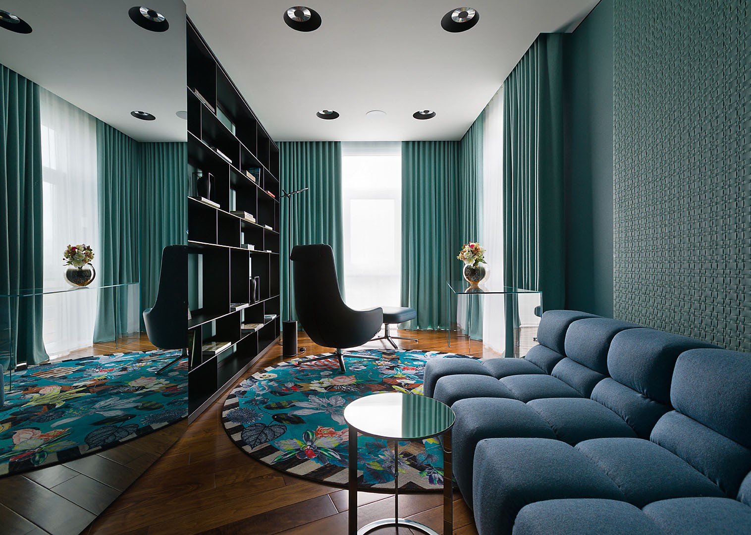 Зелёный цвет кабинета продолжает колористическую тему гостиной, расположенной рядом. Здесь на смену синему пришли оттенки зелёного с градиентной растяжкой от светло–зелёного до так называемого оттенка тиффани. На полу — паркет из массива ореха, уложенный асимметричной ёлочкой, в которой плашки разной ширины стыкуются под углом. Такой дизайн напольного покрытия придаёт динамичность пространству. Диван, журнальный столик, B&B Italia. Кресло, Vitra. Ковёр, Mooo
