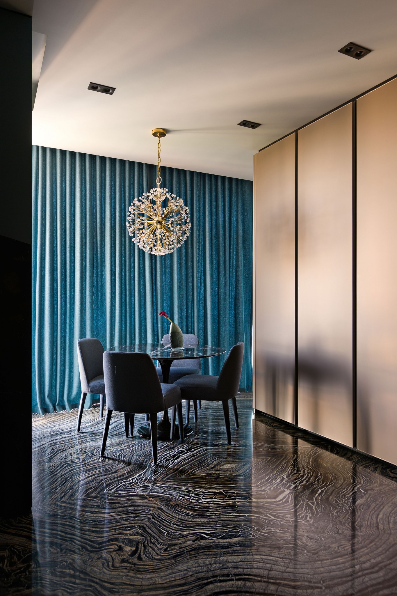 Зона кухни–столовой. В ровном, спокойном интерьере особенно выделяется пол, выложенный камнем Silver Wood с прихотливым природным рисунком, золотистые прожилки которого поддержаны бронзовым оттенком шкафов. Обеденный стол, Alivar. Стулья, B&B Italia