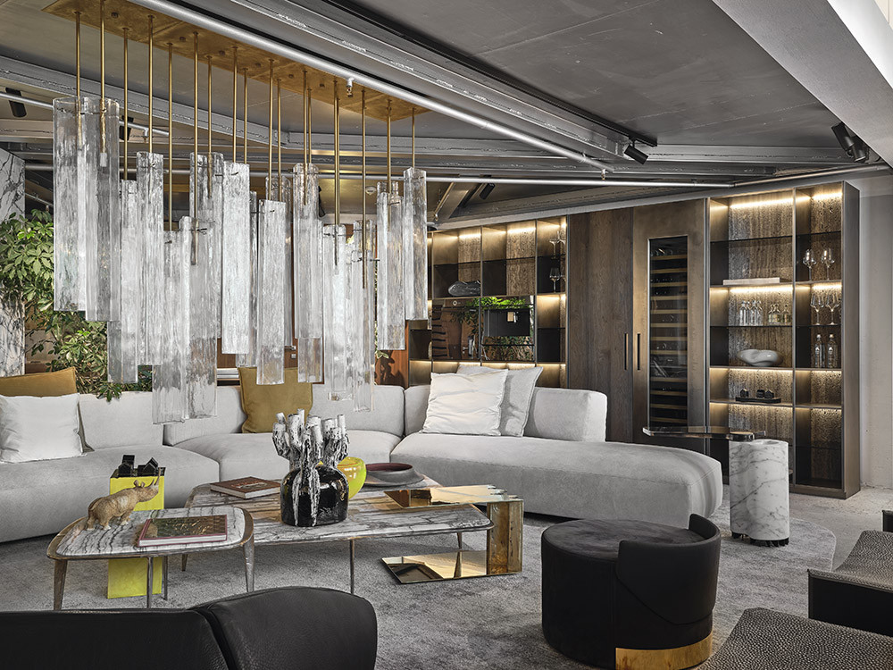 Интерьер шоурума создан как жилое пространство с особенной атмосферой. Это концепция дома, которая базируется на миксе эксклюзивных материалов в ручной обработке и внутренней архитектуры пространства. Гости могут расслабиться на диване или приготовить себе что-то вкусное на кухонном острове из цельной четырёхметровой глыбы мрамора Paonazzo