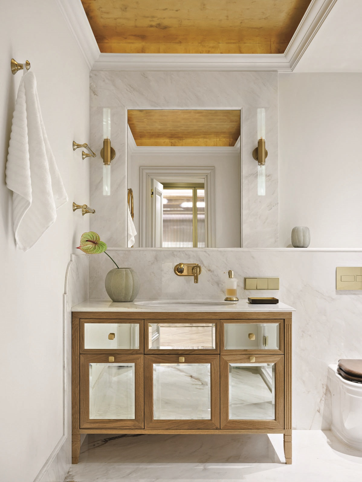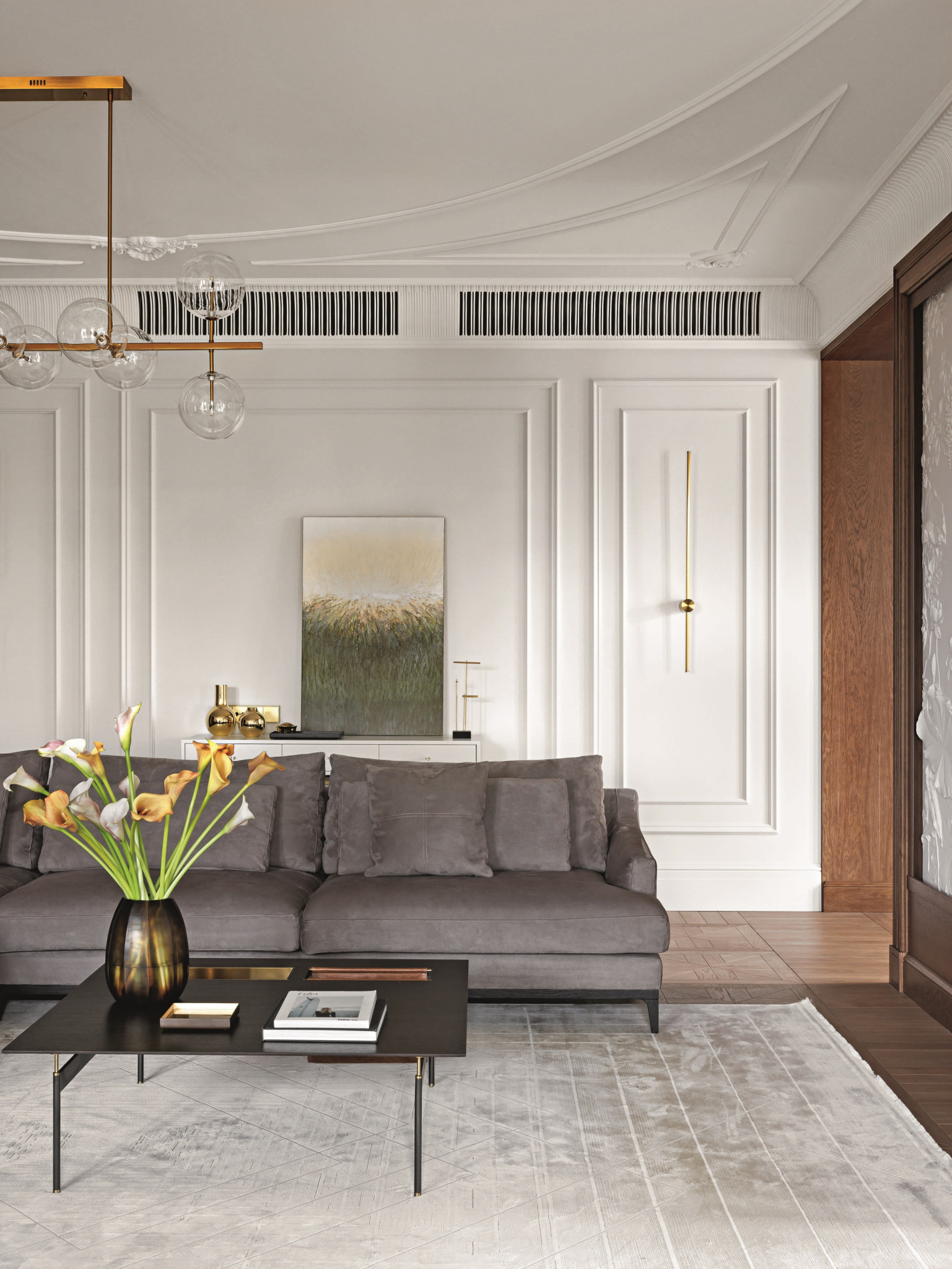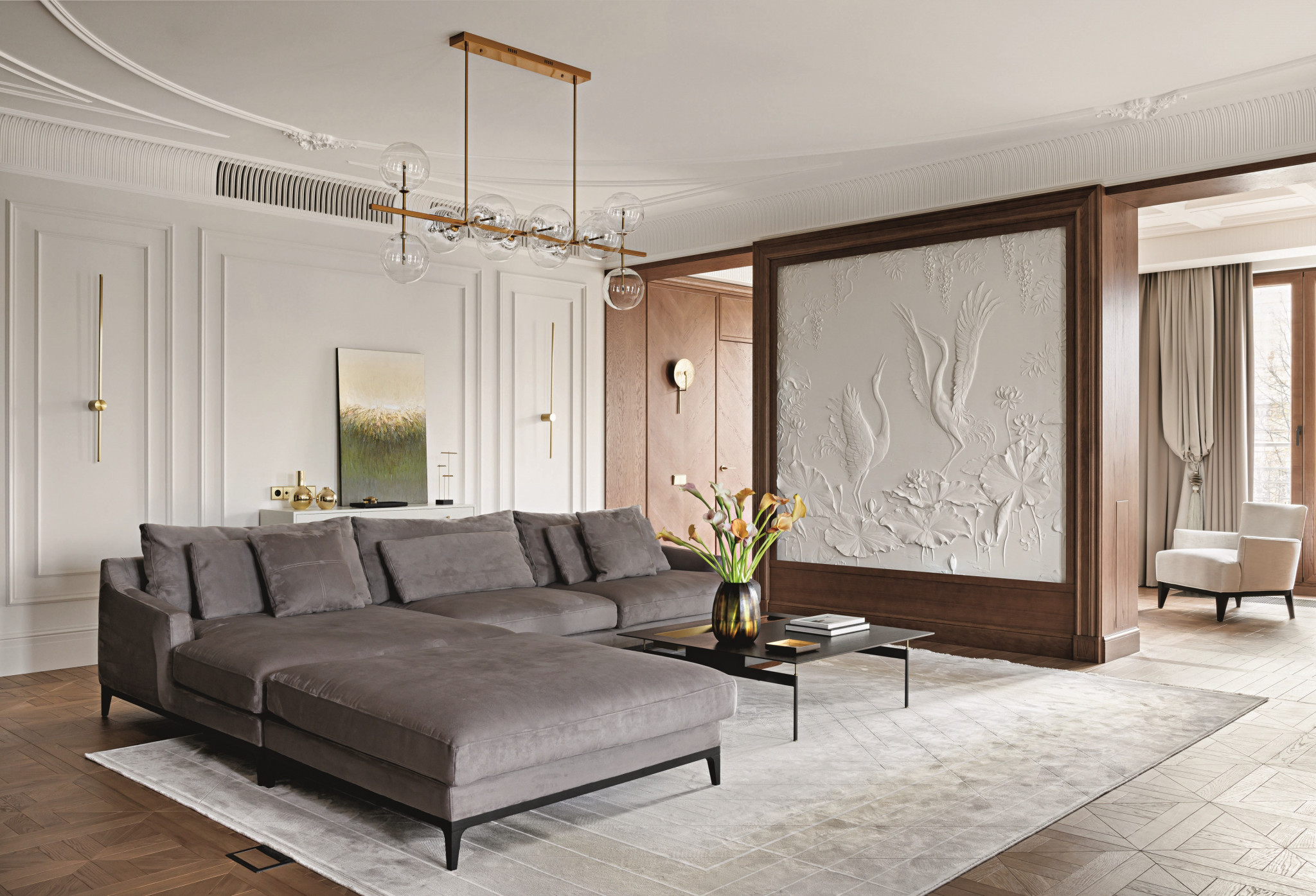 Неоклассика, по мнению авторов проекта, является основой всех интерьеров «вне времени». Этот отзывчивый и гибкий стиль подстраивается практически под любой запрос в интерьере. Он может быть сдержанным и строгим — это хорошо показано в общих пространствах. В детских он непринужденный и соседствует с различными материалами и предметами декора.