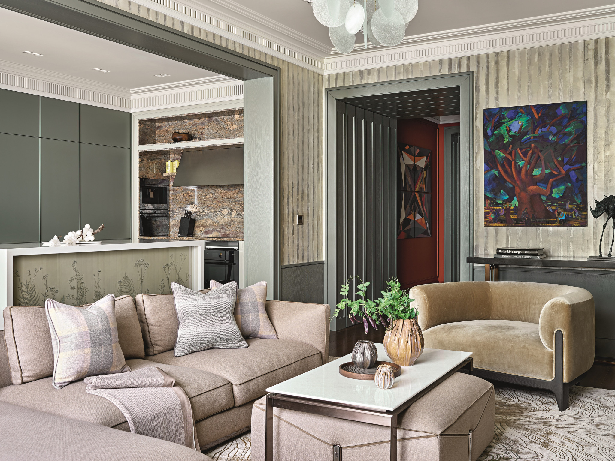 «Общая зона квартиры по площади достаточно небольшая, учитывая, что требовалось разместить тут и гостиную, и столовую, и просторную кухню. В отличие от многих современных интерьеров, кухня здесь не формальная, а действительно функциональная: в семье любят готовить и ужинать вместе», — отмечает Анна. Центральным арт–объектом общественной зоны стал кухонный остров, один из фасадов которого украшен изящным барельефом и подсветкой. Растительный узор барельефа перекликается с фактурой обеденного стола по проекту британского дизайнера Тома Фолкнера, который выполнил столешницу из слэба натурального дерева с так называемым «живым» краем. Соединяет все элементы единой общественной зоны декор стен, для которого выбрали обои