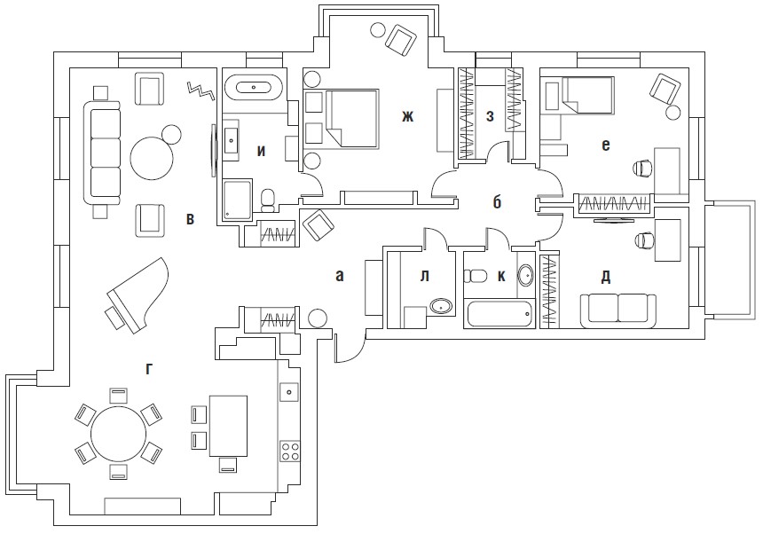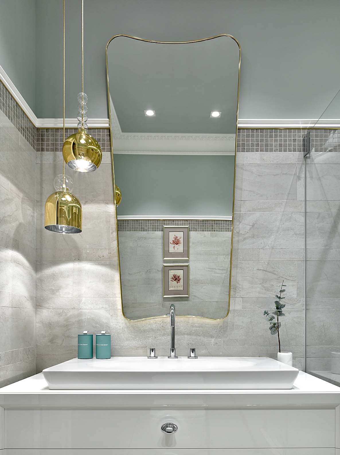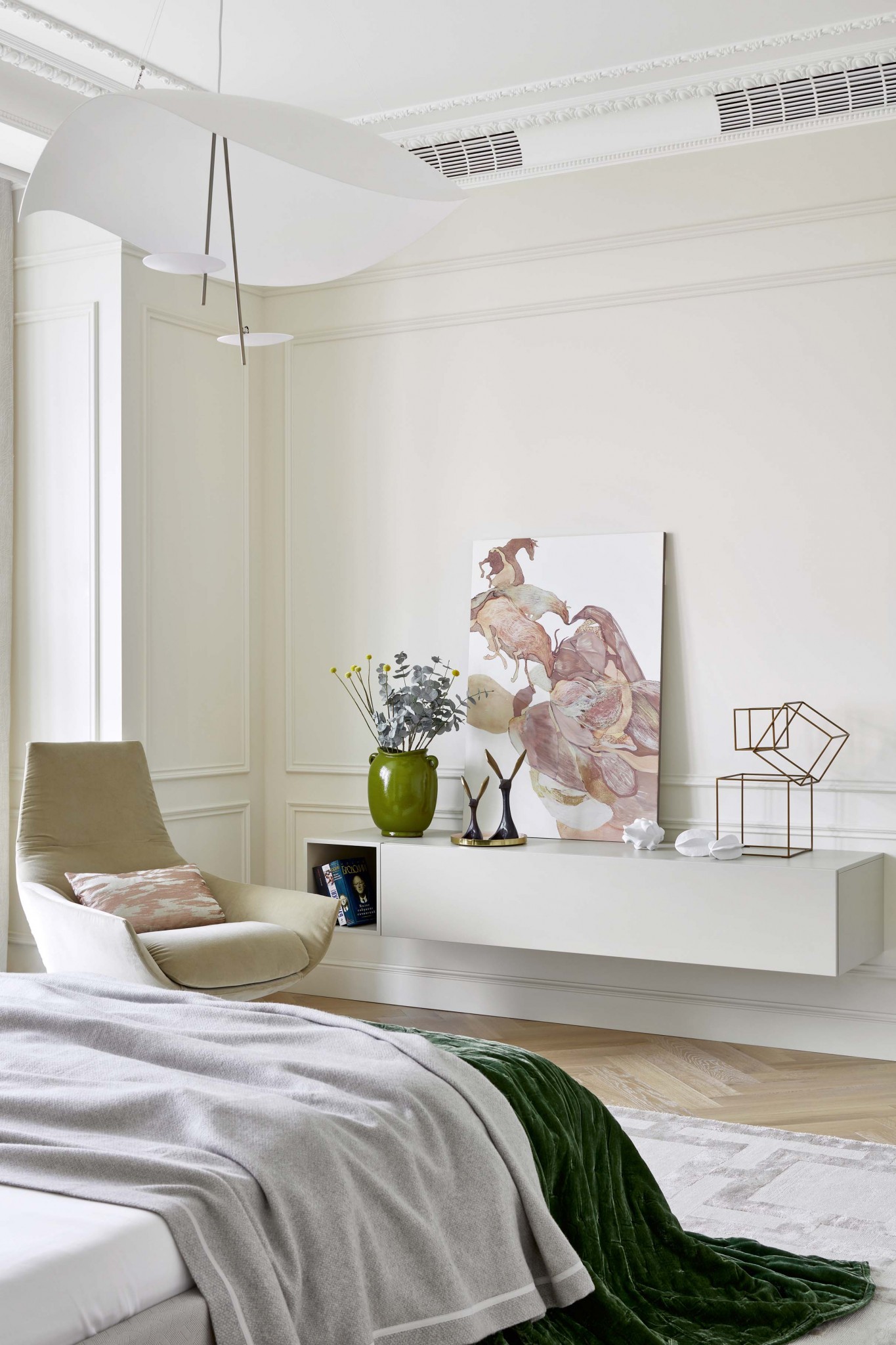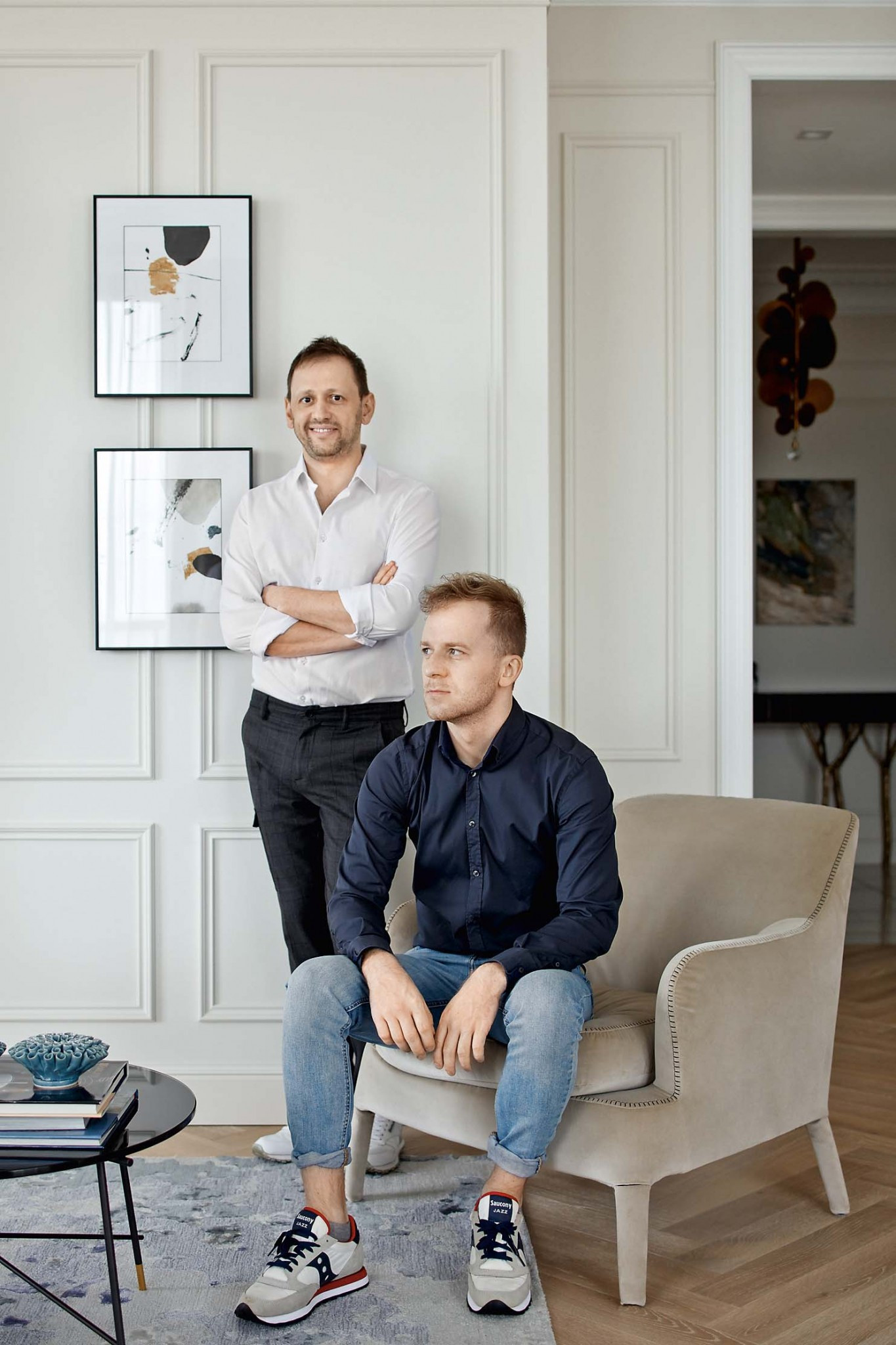 «Заказчики — интеллигентная пара с двумя детьми (старший ребёнок уже живёт отдельно) — нашли нас через социальные медиа, — рассказывает Стас Самкович. — Супруга несколько раз отмечала фото наших проектов, делала закладки, а когда встал вопрос выбора профессионала ребром, то вспомнила про свой «альбом идей» и решила нам написать». После нескольких встреч с показами коллажей и форэскизов, так называемыми «стилистическими примерками», дизайнеры предложили концепт: лёгкий, классический каркас (не перегруженный деталями) и современная начинка. Но начинка не холодная или по-галерейному слишком импозантная, а уютная, без кричащих элементов, чтобы хозяева ощущали себя дома расслабленно и легко. «Проект мы даже в шутку назвали «Лёгкое обаяние буржуазии», — поясняет Тарас Безруков. — Именно легко: легко визуально и легко энергетически. Это желание стало основным направлением в развитии всего интерьера». Мебель на тонких ножках, лепной ажурный карниз, современный, фактически невесомый светильник, глянцевые поверхности и пастельный, растушёванный цвет стен придают гостиной эффект парящего интерьера. В свою очередь, обволакивающую, уютную обстановку в спальне создаёт мебель с плавными, огибающими формами и мягкий, «плюшевый» текстиль. «Тема единого стилистического решения прослеживается во всех помещениях, меняются лишь элементы, цветовые акценты и композиции, — замечает Стас. — Только в кабинете мы немного отступили от общей концепции: выбрали для стен более глубокий цвет. В помещении много естественного света, и довольно насыщенный оттенок не выглядит особо давящим, он придаёт комнате более строгий, мужской характер».
