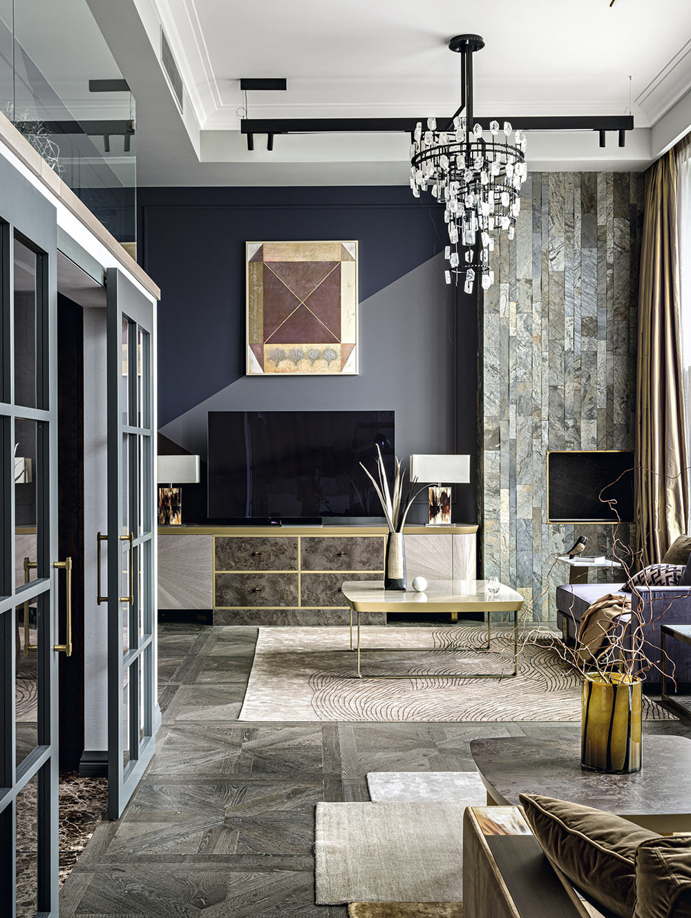 «Работа над этой квартирой началась давно, еще до пандемии, — начинает рассказ автор проекта Анна Разумеева-Смирнова. — Заказчики — мои старинные клиенты, большая семья из трех поколений. Вместе мы уже успели построить и квартиру в классическом английском стиле, и загородный коттедж в стиле прованс с элементами лофт, и квартиру для летнего отдыха в Ереване в этническом стиле. Поэтому, когда встал вопрос о городской квартире для постоянного проживания, все стили так или иначе уже были опробованы. Хотелось чего-то новенького. Учитывая название жилого комплекса «Сады Пекина» и расположенную рядом одноименную гостиницу, выбор пал на современный стиль с легкими элементами шинуазри и азиатской тематики. Тем самым в очередной раз удалось предугадать современный тренд на Восток. Среди пожеланий были брутальность, темная цветовая гамма в качестве акцента, много камня, металла и стекла». Квартира состоит из двух объединенных квартир. Планировка усложнялась панорамными окнами во всю стену и высотой потолков 4,6 метра. Вторая сложность заключалась в том, что квартиры располагались в ряд, а окна были только на одной стороне. К тому же перед дизайнером стояла задача организовать три спальни со своими санузлами и гардеробными. Однако такая высота потолков сделала возможным расположить часть нежилых помещений на двух уровнях. Теперь жилые комнаты можно было сделать побольше, а санузлы и гардеробные разместить вдоль стен без окон. Гостиную разделили на два уровня — внизу кухня, а сверху мужской клуб с курительной комнатой. Эти пространства сообщаются между собой с помощью трех лестниц, спроектированных и изготовленных компанией «АКБ дизайн». «Когда стройка подходила к концу, у заказчиков неожиданно изменились семейные обстоятельства. Мне было предложено срочно решить, какие еще две смежные квартиры лучше купить. Мы выбрали расположенные в ряд, потому что в этом случае требовалось сломать только одну некапитальную стену», — вспоминает Анна. Исходя из новых вводных, проект доработали как с точки зрения планировки, так и в плане дизайна. В квартире появились две дополнительные детские комнаты, одна спальня со своим санузлом и гардеробной, а также антресоль, где расположили общую гардеробную, а внизу детские санузлы. Заказчик долго шел к своей первой собственной квартире, поэтому хотел видеть в ней все самое лучшее и красивое. Материалы подбирались исключительно натуральные — полы из мрамора, доски от FINEX со специальной отделкой со следами пилорамы, шерстяной ковролин на антресолях. Для некоторых стен были подобраны плитки из натуральных камней с 3D-эффектом. Особое внимание уделили освещению. Были подобраны американские светильники WIRED CUSTOM LIGHTING и VISUAL COMFORT. Поставщик — компания «Миланский Дом», которая работает с невероятным количеством брендов. Люстры WIRED CUSTOM LIGHTING имеют возможность кастомизации. При одном и том же внешнем дизайне элементы люстр могли быть выполнены из разных материалов, от стекла до горного хрусталя. Помимо этого, каждому камню на люстре вручную придается неповторимая форма. Чтобы принять судьбоносное решение для интерьера,