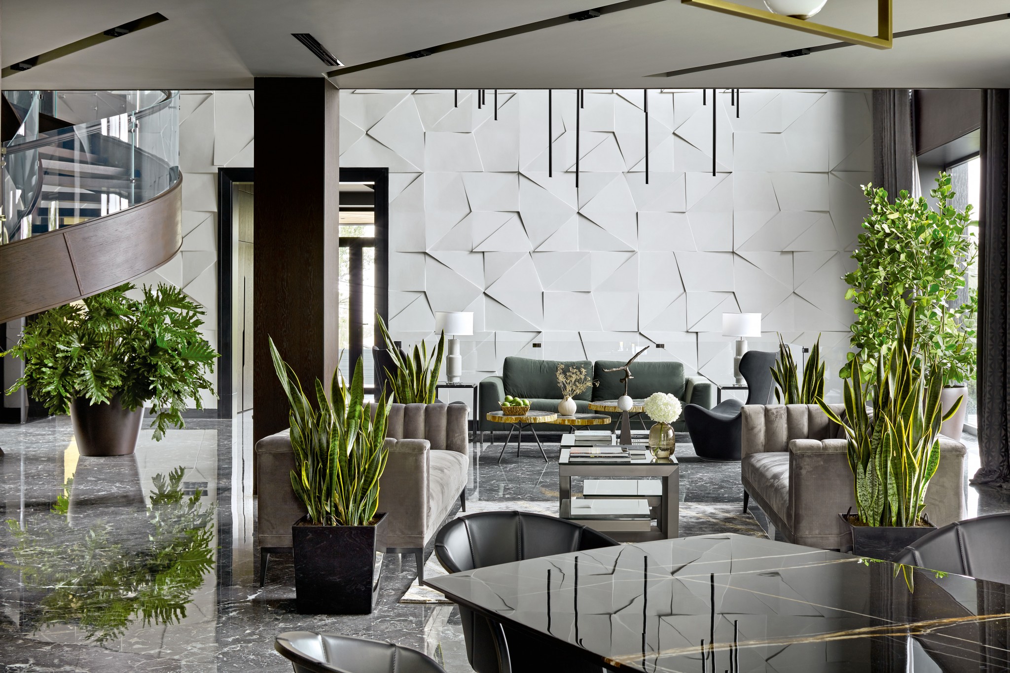 «Главный элемент в этом проекте — винтовая лестница, — комментирует Асель Баймахан.— Она стала отправной точкой при проектировании дома. Ей была отведена роль основного украшения парадного пространства, ведь это первое, что видит гость, входя в дом. Сделать такую лестницу — моя давняя мечта, и я рада, что именно здесь и концепция интерьера, и площадь помещения позволили её реализовать». Этот дом производит впечатление лаконичного интерьерного высказывания. Он величественен в статике воздушных объёмов, логике пространственных структур, открытости внешнему миру. За скупой цветовой гаммой отчётливо читается игра текстур: камень, дерево, металл и текстиль предстают в комбинациях сияюще–гладких и нарочито фактурных поверхностей. И если на первом этаже перевес явно в пользу бликующих эффектов (полированный камень пола и столешниц, стеклянное ограждение лестницы и галереи второго этажа, хромированные детали мебели), то в приватных помещениях те же самые материалы ведут себя намного спокойнее. Там стены отделаны шпоном, обилие велюровых тканей и ковров добавляет уюта, и даже каменный декор стен в ванных