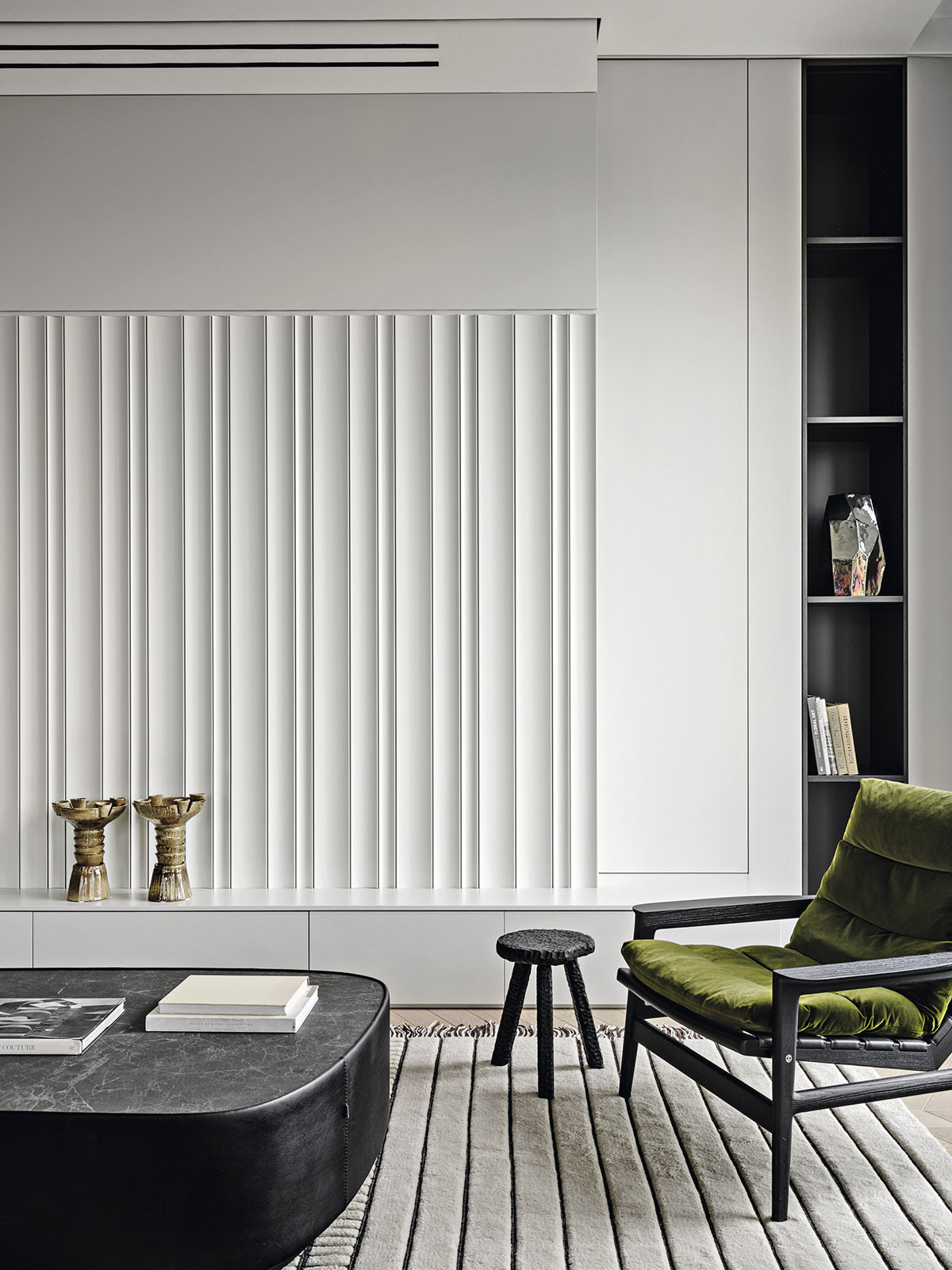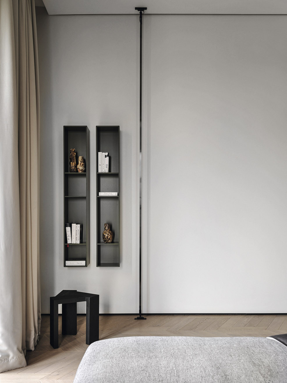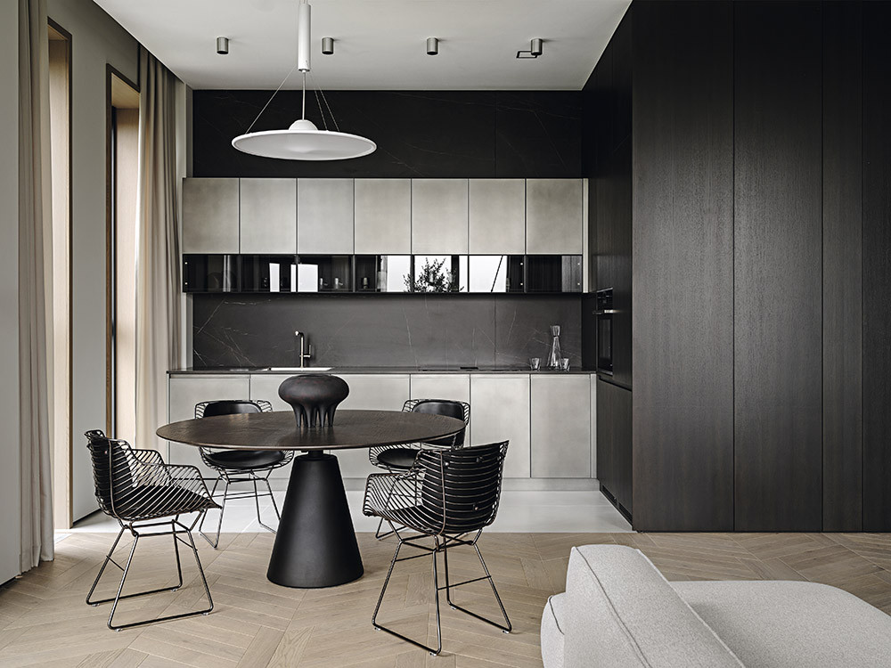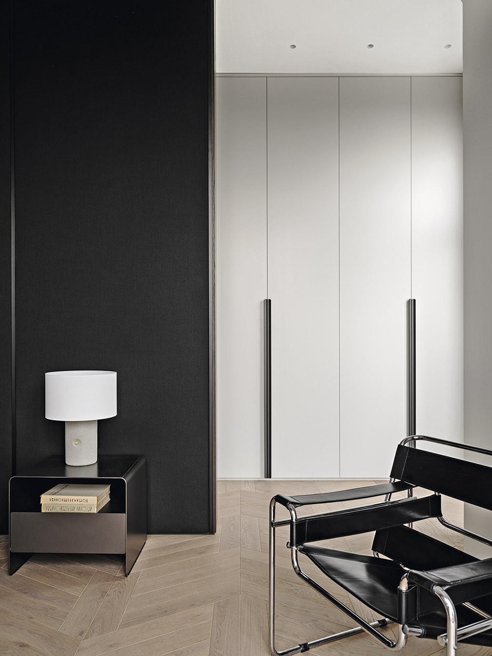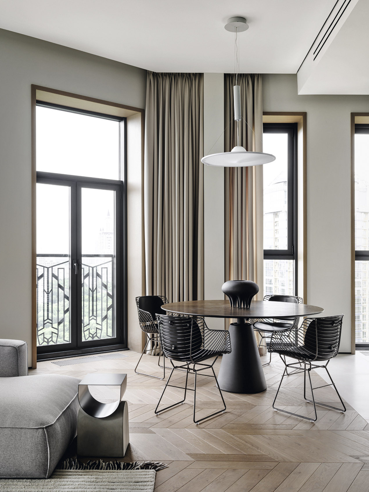 Гостиную буквально опоясывают большие панорамные окна, впускающие в интерьер динамичное настроение большого города. Мебель же здесь подобрана максимально удобная и комфортная для встречи больших компаний. Зону отдыха формируют широкие и низкие диваны MONONOVA, а также прочный и эргономичный журнальный столик. «В подборе мебели и аксессуаров мы были нацелены на предметы, которые помогали создать эргономичное пространство, где одинаково удобно и смотреть кино большой компанией, и общаться, и танцевать», — говорит Борис. Современный и во многом брутальный характер интерьера не лишил его домашних и уютных черт. Благодаря смелому соединению натуральных отделочных материалов и минимализма авторам проекта удалось достичь необходимого баланса. В высокие потолки вмонтировали технический свет, а для гостиной и зоны кухни подобраны лаконичные светильники. Полы же в единой общественной зоне обшили натуральным паркетом светлых тонов с практически классическим узором «елочка». Ноту классики в современный интерьер добавляет и стена в гостиной, выполненная из деревянных панелей с канелюрами. Домашнее тепло и динамичность соединил в себе масштабный ковер DОVLET HOUSE с архитектурным геометричным рисунком. Его мягкость выгодно контрастирует с металлом стульев и кухонными фасадами, чья холодная матовая поверхность оттеняет настенные панели из темного натурального дерева. «Таким образом интерьер проявляет свой брутальный, мужской характер, но при этом сохраняет необходимый любому жилому пространству уют и комфорт», — объясняет Борис Уборевич-Боровский. Аналогичный прием применили в интерьере спальни и всей приватной зоны. Часть стен хозяйской спальни декорирована панелями из темного тонированного дуба, полы при этом обшиты светлым паркетом. Еще один уровень контрастности заложен в сочетании общей монохромной гаммы и ярких акцентов в виде живописных картин. Работы Константина Zmogk Данилова появляются и в зоне гостиной, и в рабочем кабинете. В приватной же зоне цветовые акценты уступают место знаковым предметам мебельного дизайна. Настоящим украшением спальни и самостоятельным арт-объектом стало коллекционное кресло в честь Василия Кандинского (модель «Василий») от Марселя Брайера в стиле конструктивизма. Таким образом несколько уровней контраста — цветовой, фактурный и стилистический — сформировали динамичный и одновременной брутальный интерьер для современного молодого человека.
