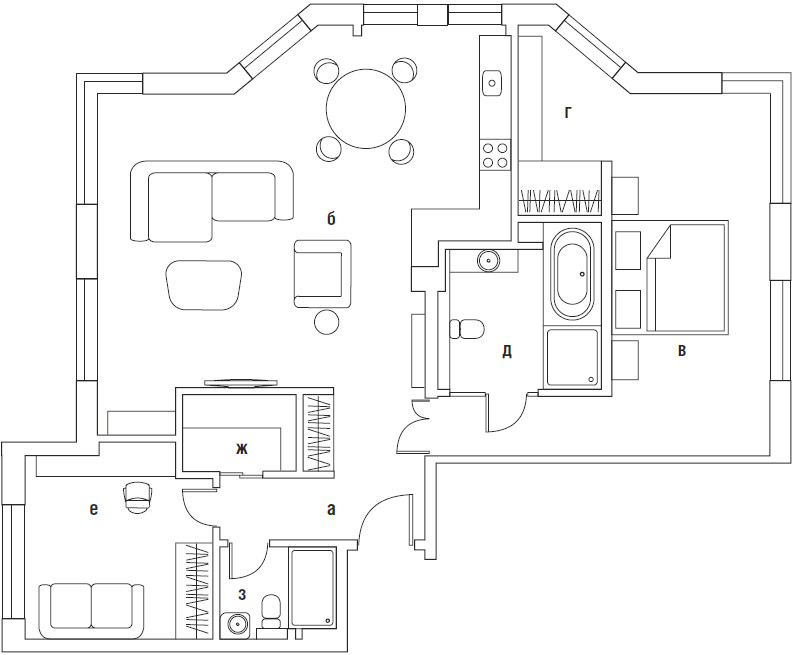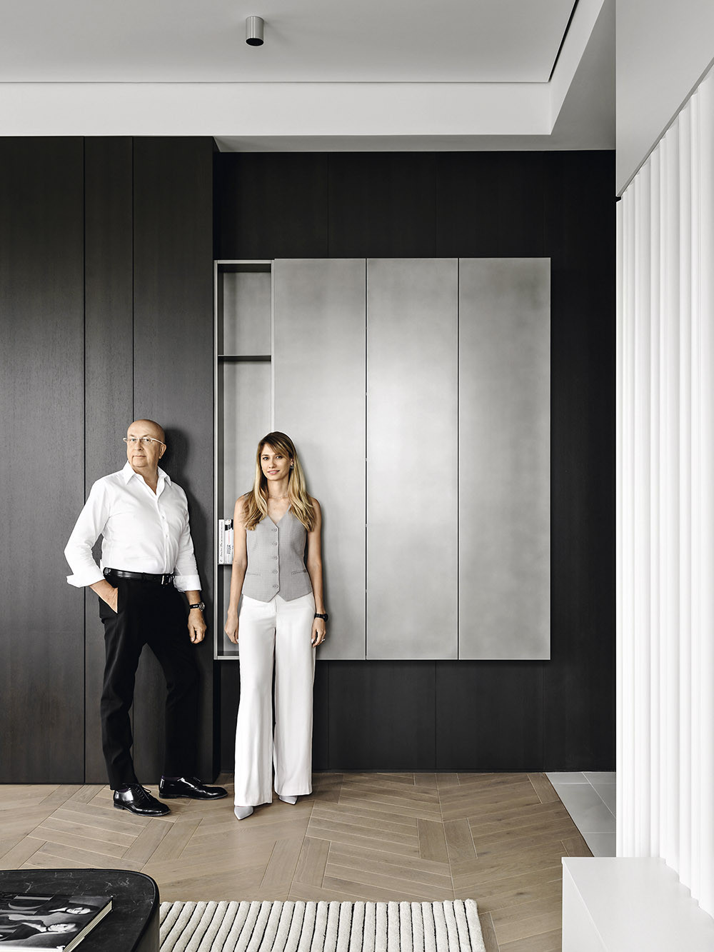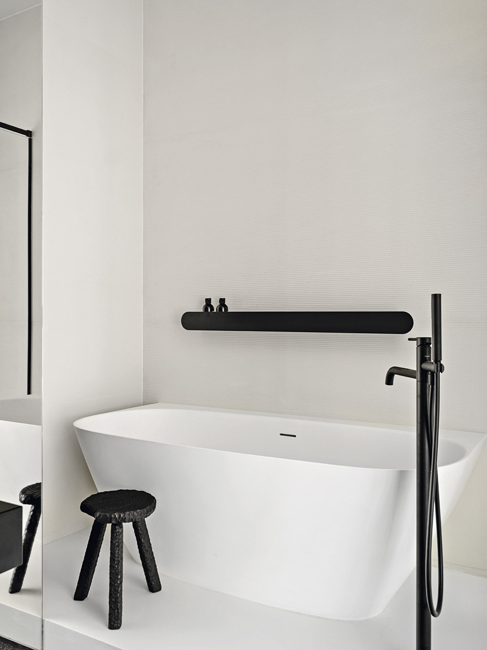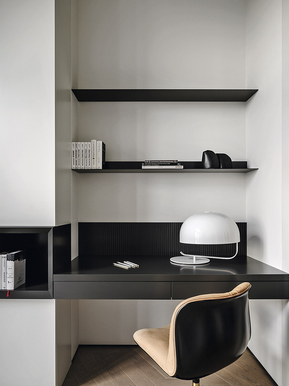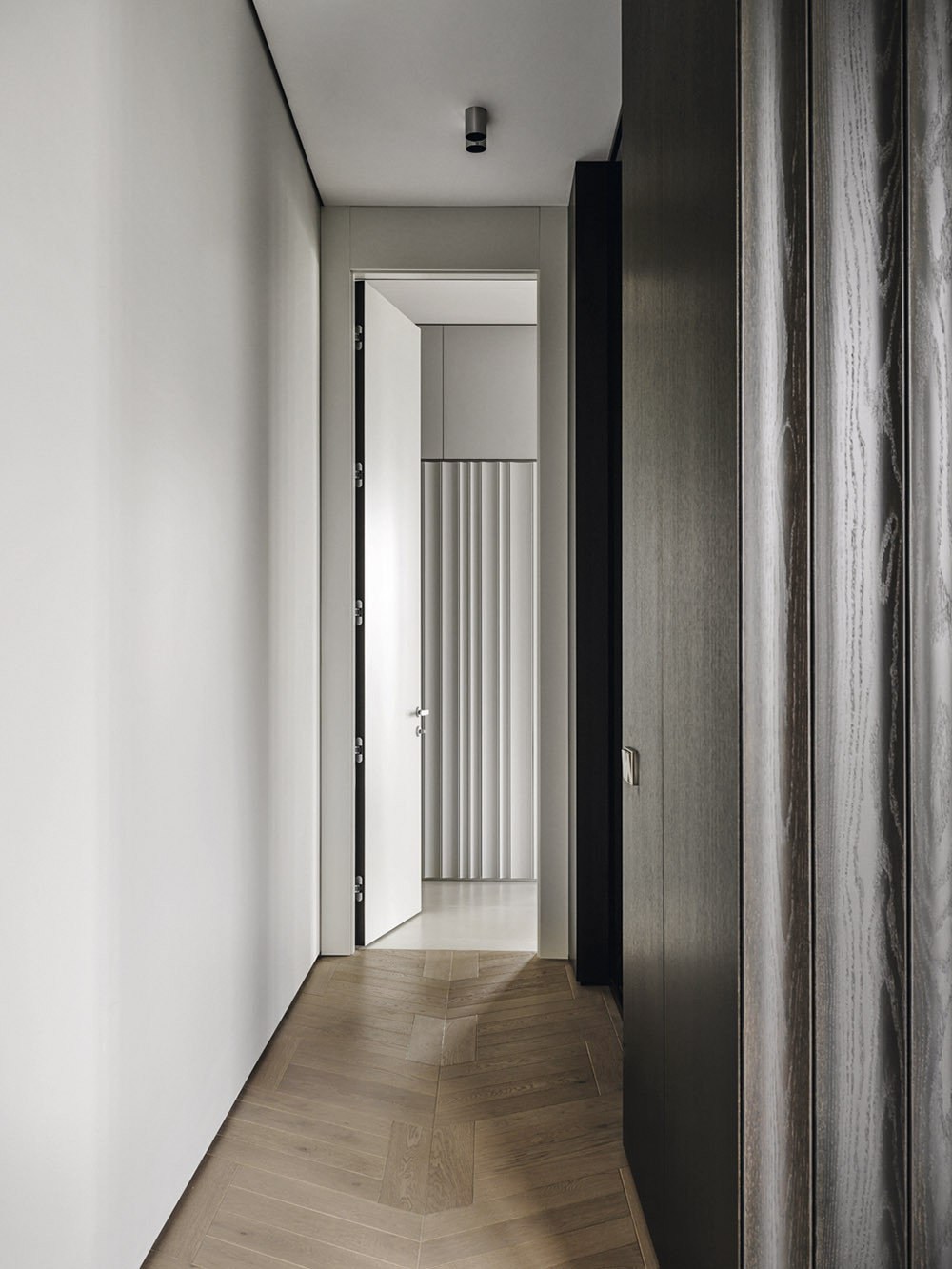 Гостиную буквально опоясывают большие панорамные окна, впускающие в интерьер динамичное настроение большого города. Мебель же здесь подобрана максимально удобная и комфортная для встречи больших компаний. Зону отдыха формируют широкие и низкие диваны MONONOVA, а также прочный и эргономичный журнальный столик. «В подборе мебели и аксессуаров мы были нацелены на предметы, которые помогали создать эргономичное пространство, где одинаково удобно и смотреть кино большой компанией, и общаться, и танцевать», — говорит Борис. Современный и во многом брутальный характер интерьера не лишил его домашних и уютных черт. Благодаря смелому соединению натуральных отделочных материалов и минимализма авторам проекта удалось достичь необходимого баланса. В высокие потолки вмонтировали технический свет, а для гостиной и зоны кухни подобраны лаконичные светильники. Полы же в единой общественной зоне обшили натуральным паркетом светлых тонов с практически классическим узором «елочка». Ноту классики в современный интерьер добавляет и стена в гостиной, выполненная из деревянных панелей с канелюрами. Домашнее тепло и динамичность соединил в себе масштабный ковер DОVLET HOUSE с архитектурным геометричным рисунком. Его мягкость выгодно контрастирует с металлом стульев и кухонными фасадами, чья холодная матовая поверхность оттеняет настенные панели из темного натурального дерева. «Таким образом интерьер проявляет свой брутальный, мужской характер, но при этом сохраняет необходимый любому жилому пространству уют и комфорт», — объясняет Борис Уборевич-Боровский. Аналогичный прием применили в интерьере спальни и всей приватной зоны. Часть стен хозяйской спальни декорирована панелями из темного тонированного дуба, полы при этом обшиты светлым паркетом. Еще один уровень контрастности заложен в сочетании общей монохромной гаммы и ярких акцентов в виде живописных картин. Работы Константина Zmogk Данилова появляются и в зоне гостиной, и в рабочем кабинете. В приватной же зоне цветовые акценты уступают место знаковым предметам мебельного дизайна. Настоящим украшением спальни и самостоятельным арт-объектом стало коллекционное кресло в честь Василия Кандинского (модель «Василий») от Марселя Брайера в стиле конструктивизма. Таким образом несколько уровней контраста — цветовой, фактурный и стилистический — сформировали динамичный и одновременной брутальный интерьер для современного молодого человека.