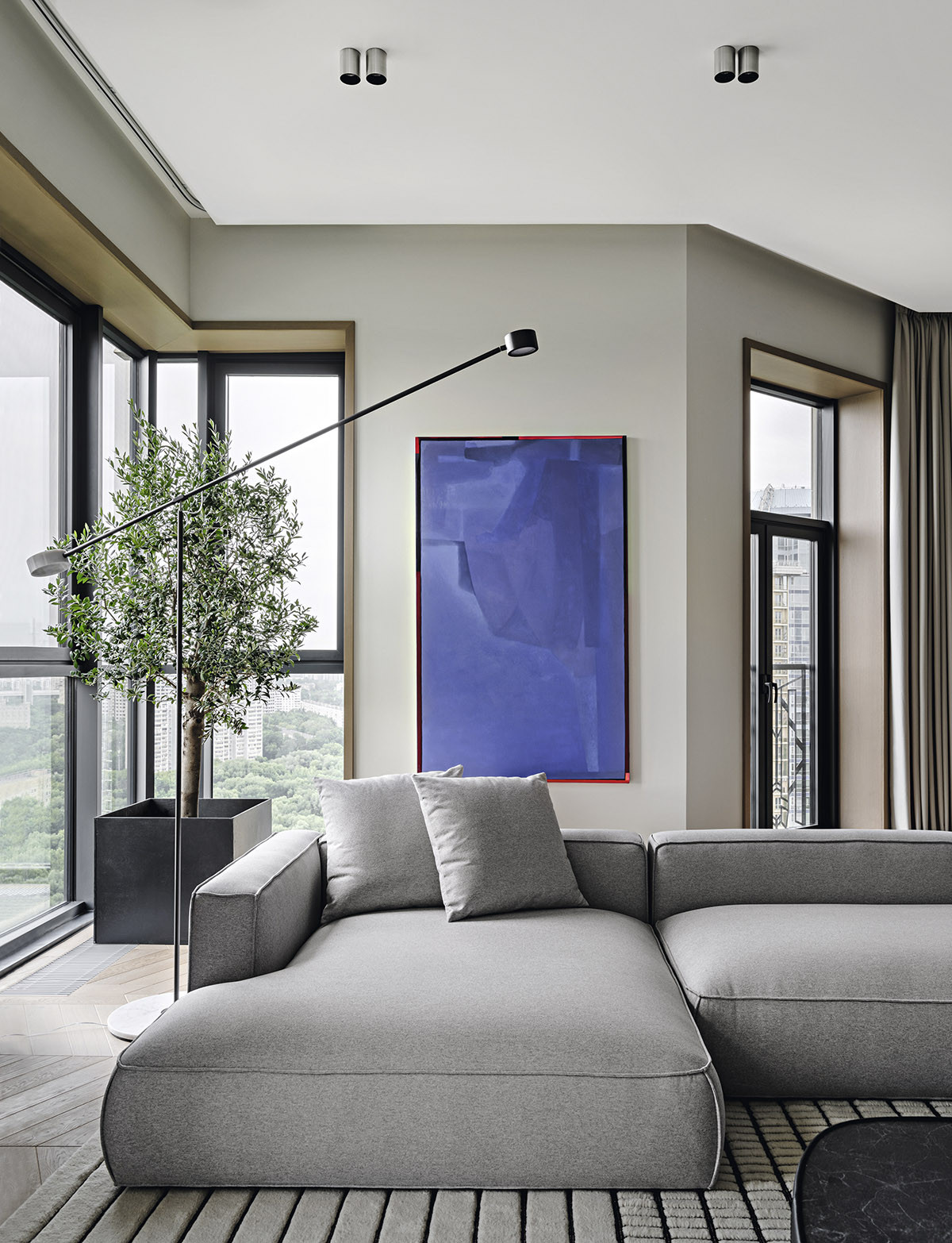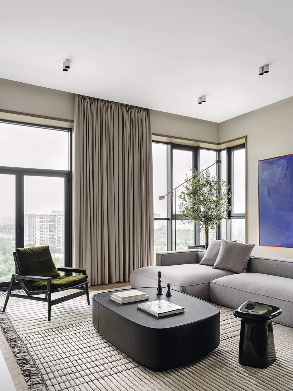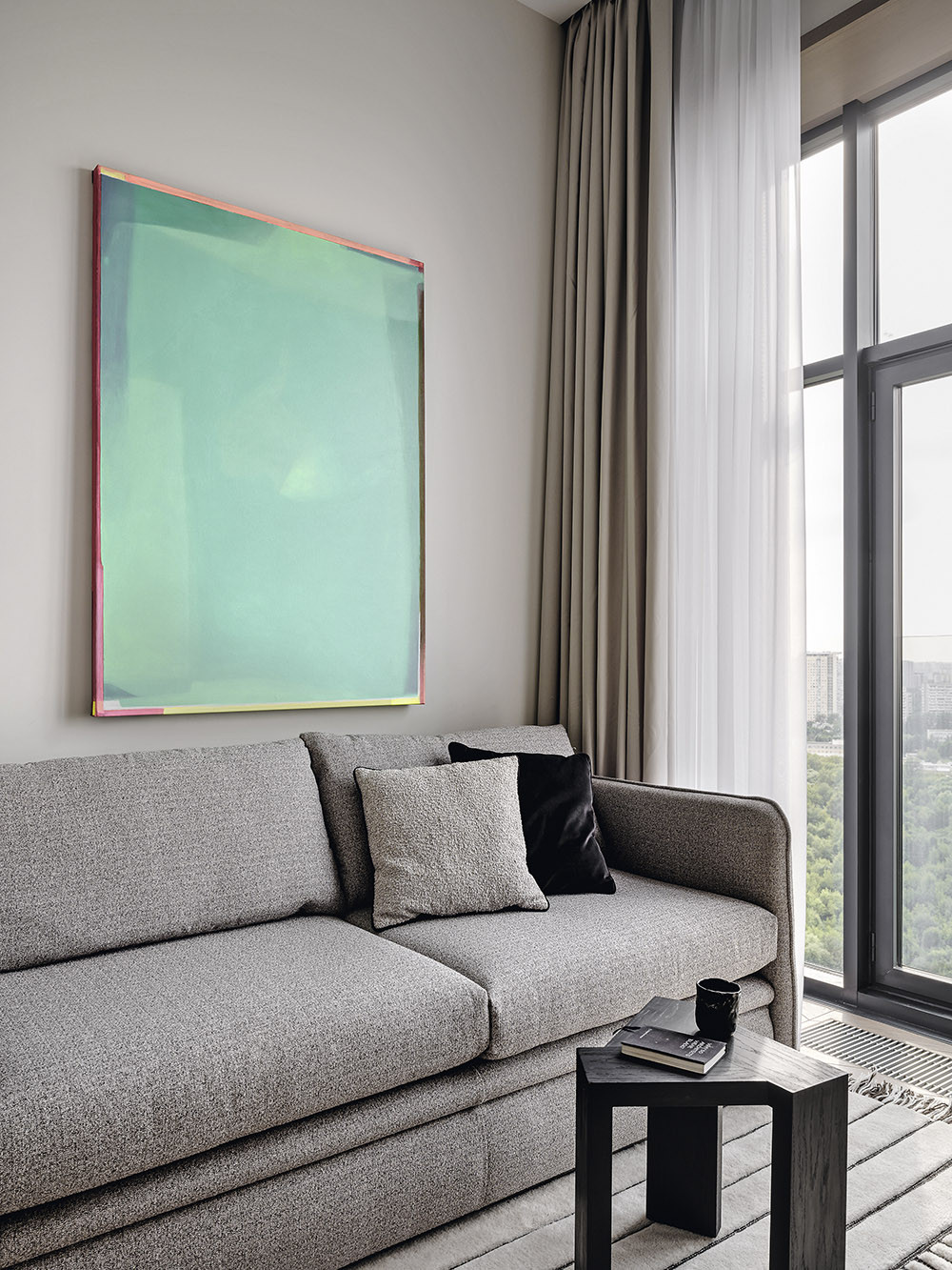 Интерьер квартиры на юго-западе Москвы его авторы из студии архитектуры ub.design создавали с учетом захватывающего панорамного вида на город. «Фактически это пентхаус на 25-м этаже, с высокими потолками и окнами в пол. Именно эта открытость городу легла в основу нашей работы над проектом», — рассказывает руководитель проекта Борис Уборевич-Боровский. Другим важным фактором было соответствие интерьера стилю самого хозяина — молодого человека, студента, который стоит в начале своей самостоятельной жизни. Поэтому квартира должна была превратиться в удобную площадку не только для отдыха и учебы, но также для встречи гостей и общения с друзьями. «Значит, главным и самым важным пространством здесь становится гостиная, которую мы соединили с зоной столовой и кухней», — поясняет Борис.