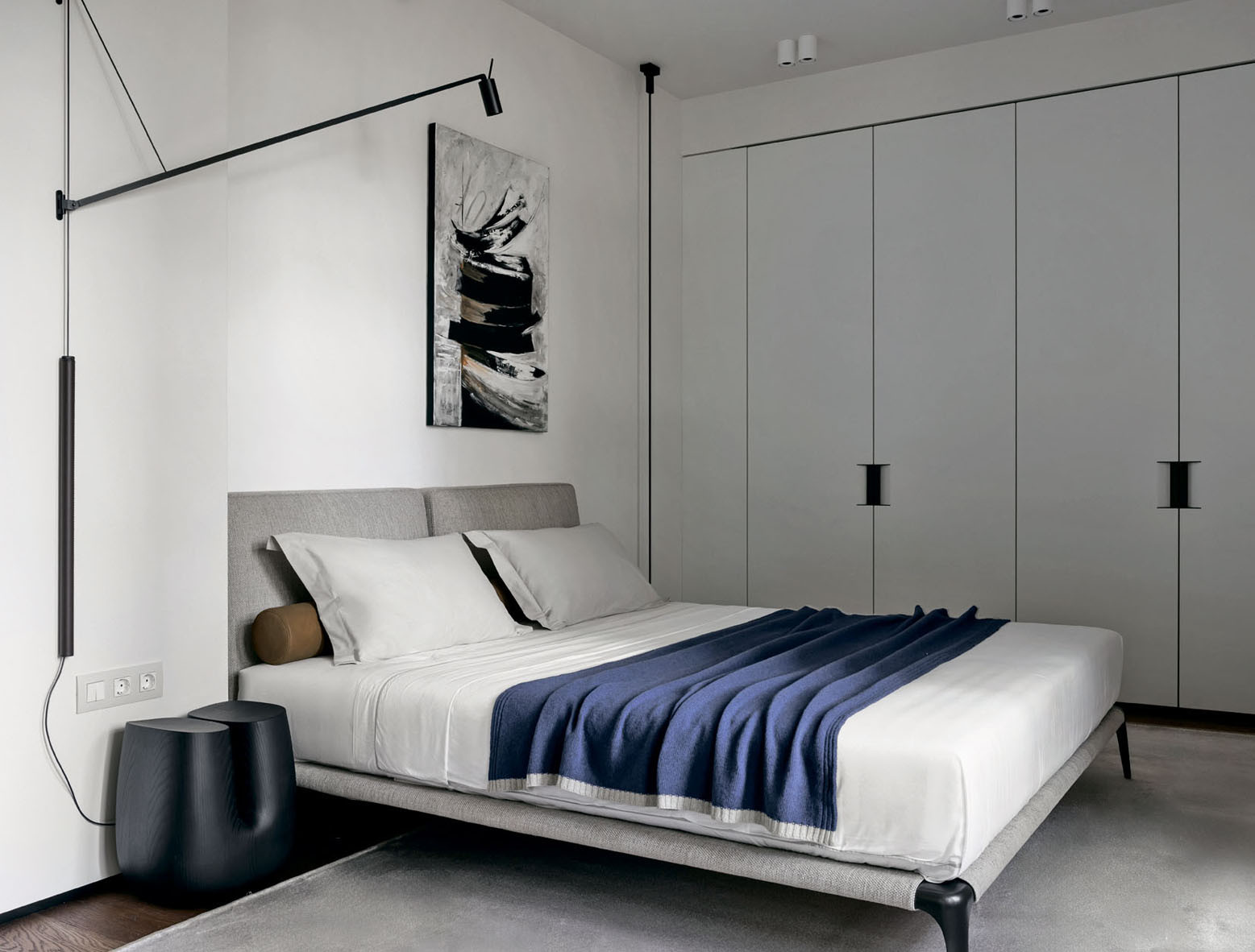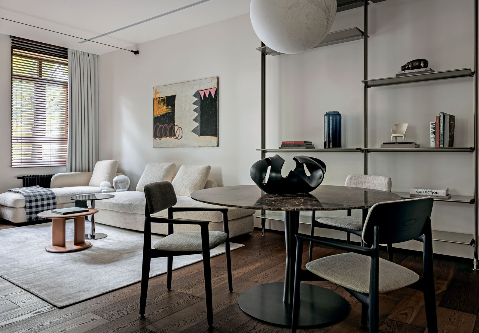 Исходная планировка была переосмыслена с точки зрения эргономики и потребностей домочадцев. Пространство гостиной объединили с кухней, дверные проемы расширили, а за счет площади прихожей организовали удобную хозяйственную комнату. Разбросанные по квартире системы хранения стали более продуманными и сосредоточенными. В основе цветовой гаммы — светлые монохромные стены, создающие ощущение простора и легкости. Им противопоставлены глубокие оттенки, навеянные каштанами за окном. Этот природный акцент проявился в лаконичных панелях из шпонированного американского ореха. Напольное покрытие из инженерной доски обожженного дуба и керамогранит с текстурой травертина в санузлах добавили графичности и тактильной теплоты. Элегантные двери Rimadesio с полотнами из матового стекла подчеркивают чистоту линий. Кухонная мебель, включающая остров, решена в строгой темной гамме. Все оконные проемы также подчеркнуты панелями из темного дуба. Этот насыщенный оттенок объединяет пространства, подчеркивая декор и детали во всей квартире, такие как барная стойка от Poliform из черного вяза на кухне. «Мы долго определялись с расположением кухни, пока не придумали вынести два высоких пенала на границу с гостиной, объединив их материалом с отделкой ТВ-панели. Это создало цельный архитектурный блок и четко обозначило переход между зонами», — дополняет Татьяна. Особую роль играет освещение. Подвесной светильник Moon от Davide Groppi парит над обеденным столом, а световые линии Infinito Endless, расположенные горизонтально и вертикально в гостиной, спальне и санузле, создают эффект бесконечности и работают как самостоятельные арт-объекты. Этот интерьер — индивидуальная история, где монохромная основа и строгость минимализма смягчены теплом натуральных материалов. Пространство, где каждая деталь создает атмосферу спокойной, вневременной роскоши.