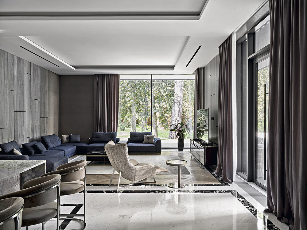 На первом этаже расположилась просторная гостиная с расслабляющей мягкой мебелью Fabio Bonfà. Здесь можно посидеть у дровяного камина и полюбоваться лесом в обрамлении высоких окон. Также внизу находится спа-центр с бассейном, хаммамом и сауной. В нем ключевую роль играет освещение: множество линейных светильников может кардинально преобразить атмосферу в вечерние часы и создать атмосферу утонченной роскоши. Мебель из дерева ироко от m2 atelier, рассчитанная как для интерьера, так и для outdoor-пространств, изысканно смотрится в зоне бассейна с выходом на террасу. На втором этаже — детские спальни и гостиная, а еще выше — блок хозяев с отдельной террасой. Здесь царит приватность — дом спроектирован так, что эту зону нельзя увидеть снаружи или из других помещений. В спальне хозяйки архитектор разместил встроенный в стену камин, а за мягким изголовьем кровати от Alessandro La Spada прячется вход в дополнительную гардеробную. Как и сам дом, участок в 0,42 гектара стал полноправным аспектом проекта. Главная подъездная дорожка с кольцевой развязкой напоминает старинные русские усадьбы. Вокруг раскинулся уединенный сад с деревьями бонсай, углублением для костра и плавно изогнутыми тропинками. Сергей Буринский адаптировал мировые тренды для холодного климата — в зимние месяцы дорожки отапливаются, а вечнозеленые деревья поддерживают зонирование территории.