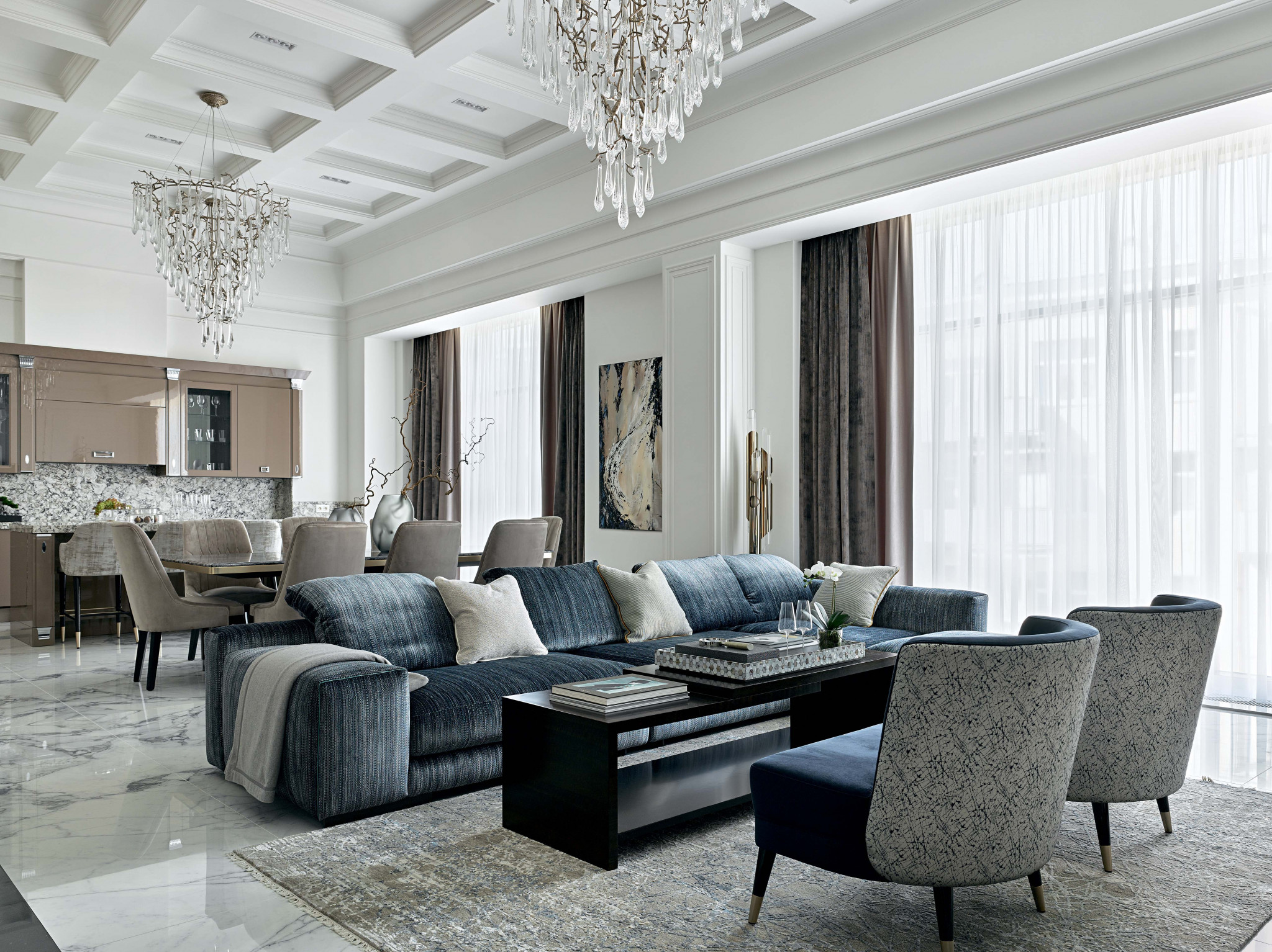 Заказчики купили квартиру не для постоянного проживания: они часто путешествуют и используют её в качестве личного отеля, а сами живут не в Москве. Приоритетной задачей для автора проекта было создание функционального пространства, лёгкого и воздушного, с применением современных приёмов оформления. У апартаментов вытянутая форма с фасадным остеклением по одной стороне. Это во многом обусловило организацию пространства. Кроме общественной зоны, всем остальным помещениям, увы, не досталось естественного света. Поэтому дизайнер предусмотрела многосложную систему освещения (парадные люстры, подсветку потолков, бра и встроенные светильники), сделала упор на светлую цветовую гамму, которая визуально облегчила интерьер, а акценты взяли на себя предметы обстановки. «Самым сложным было добавить естественного света в спальни, — поясняет Ольга Волченкова. — Они из‑за исходных особенностей остались без окон. Поэтому я спроектировала витражные перегородки. С одной стороны они оформлены рулонными шторами, которые можно закрыть. Если смотреть со стороны прихожей, витраж имеет зеркальный эффект, что создаёт ещё большую приватность в спальнях. Ощущение света усиливают и глянцевые полы
