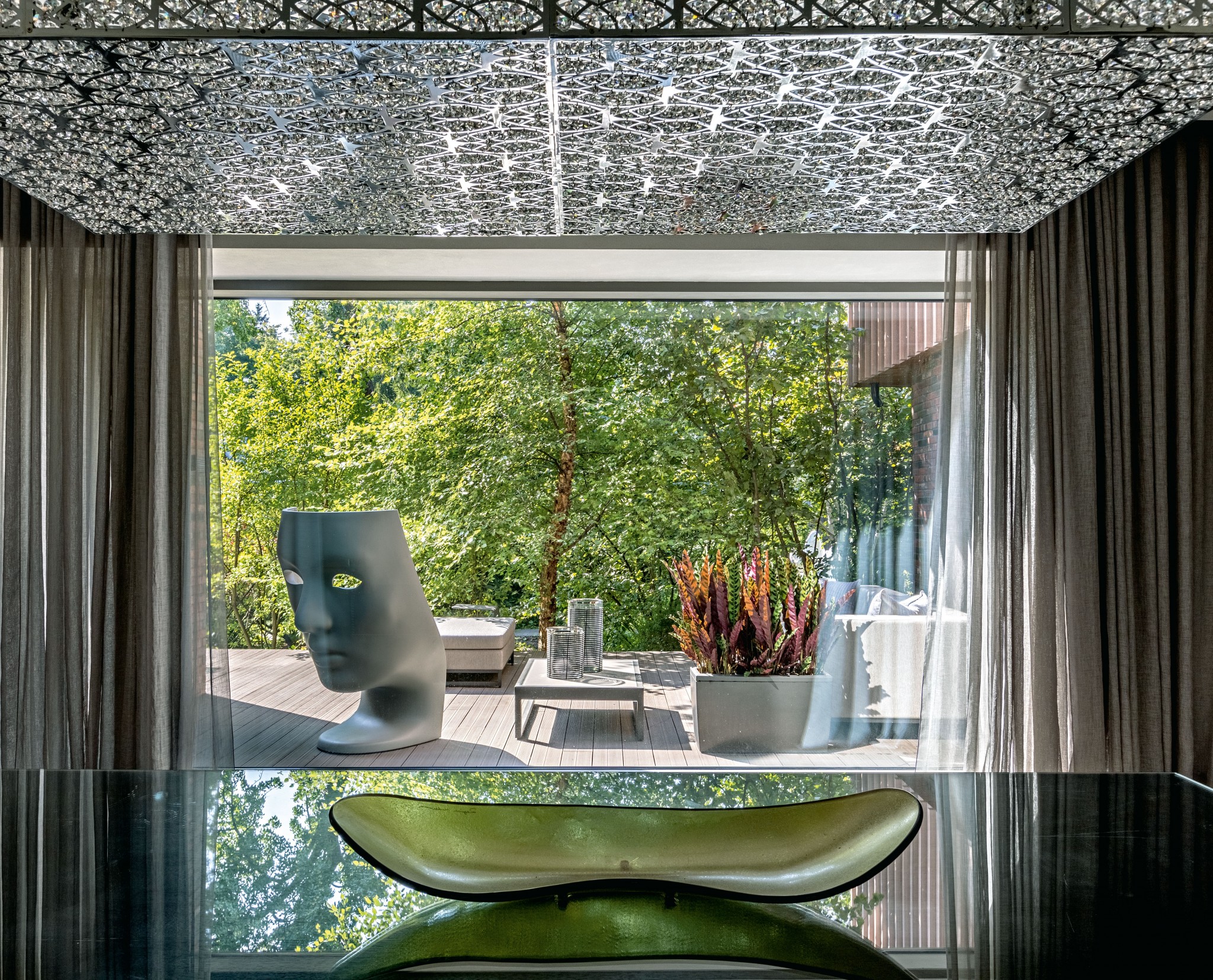 Посёлок художников — живописное место неподалёку от центра Москвы, где находятся частные дома с небольшими участками земли. Как замечает автор проекта Ирина Мавродиева, им повезло прикоснуться к прекрасному и построить дом в этом историческом месте. Название посёлка во многом определило тему проекта: основой интерьера стала живопись. Заказчики много лет коллекционируют работы современных российских художников, один из их любимых авторов — Александр Жерноклюев. Его работы украшают гостиную, столовую и другие комнаты, некоторые полотна художник написал специально для интерьера, как, например, масштабный диптих для лестничного холла. Каждая из картин занимает особое место в доме и создаёт неповторимую атмосферу. В качестве фона архитекторы выбрали нейтральный цвет — полотна на серых стенах выделяются и смотрятся ярким цветовым пятном. «За счёт того что декоративные финишные покрытия наносились в несколько слоёв, стены в зависимости от освещения и цветовой гаммы способны менять оттенок, впитывать или отражать его, — поясняет Ирина. — Кроме того, в каждом помещении у серого свой оттенок, поэтому восприятие пространства постоянно меняется, при движении по дому картинка становится разнообразнее, богаче. Мебель и предметы