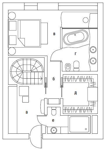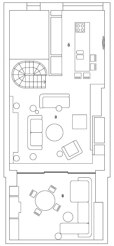 Одним из пожеланий владельцев была большая гостиная для приятного времяпровождения и приёма гостей. Исходя из особенностей пространства, её расположили на втором этаже квартиры, объединив с кухней–столовой. К гостиной примыкает открытая терраса, где можно насладиться утренним кофе и любоваться панорамными видами Москвы. Нижний уровень заняли приватные помещения. Часть комнаты не имеет окон. Поэтому архитекторы применили современные технологии: стеклянные перегородки из smart–стекла, наполняющие пространство естественным светом, при этом не в ущерб приватности. Отдельного внимания заслуживает полувинтовая лестница между этажами, металлическая конструкция которой одновременно выступает в качестве перил и изготовлена специально для этой квартиры.