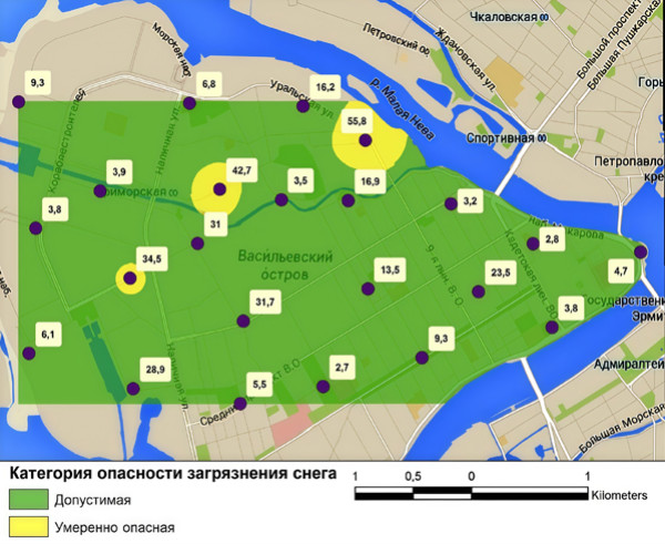 Подробнее с результатами исследования почв и снега на Васильевском острове можно ознакомиться в статье: Лебедев С. В., Агафонова Е. К. Экологогеохимическая оценка загрязнения окружающей среды по данным мониторинга содержания тяжелых металлов в почвогрунтах и снежном покрове (на примере Василеостровского района Санкт-Петербурга) // Вестник СПбГУ. Науки о Земле. 2017. Т. 62. ВЫП. 4. С. 357–369. https://doi.org/10.21638/11701/ spbu07.2017.403
